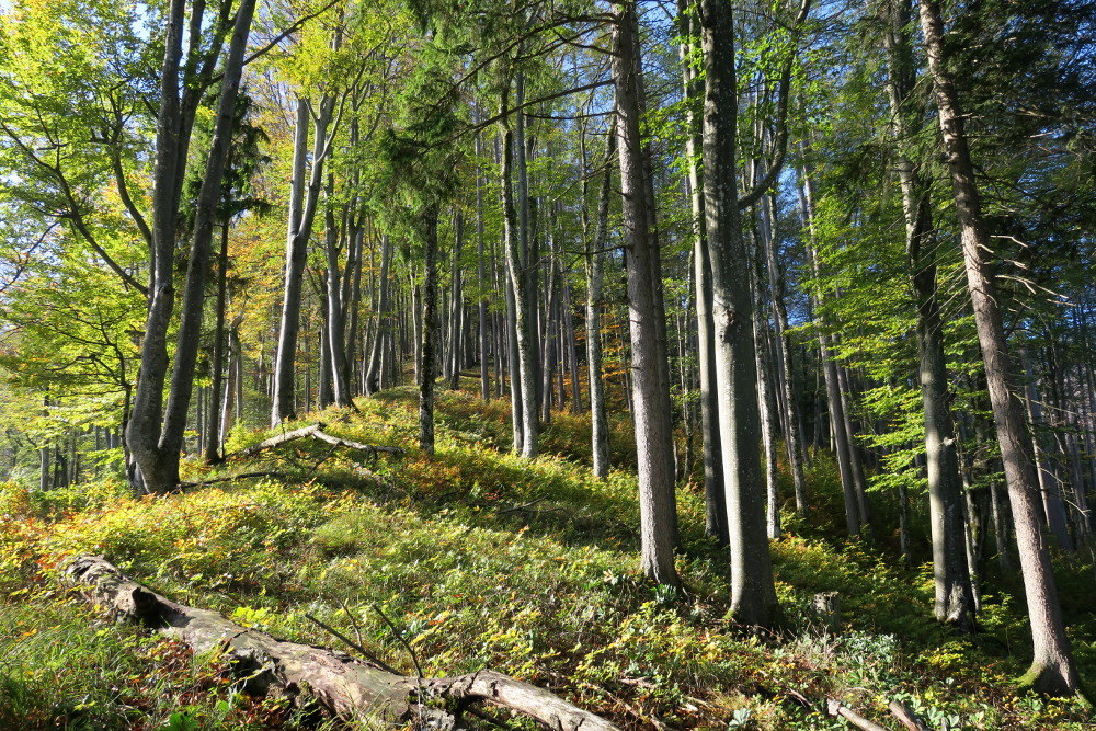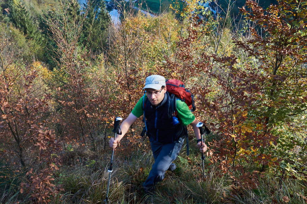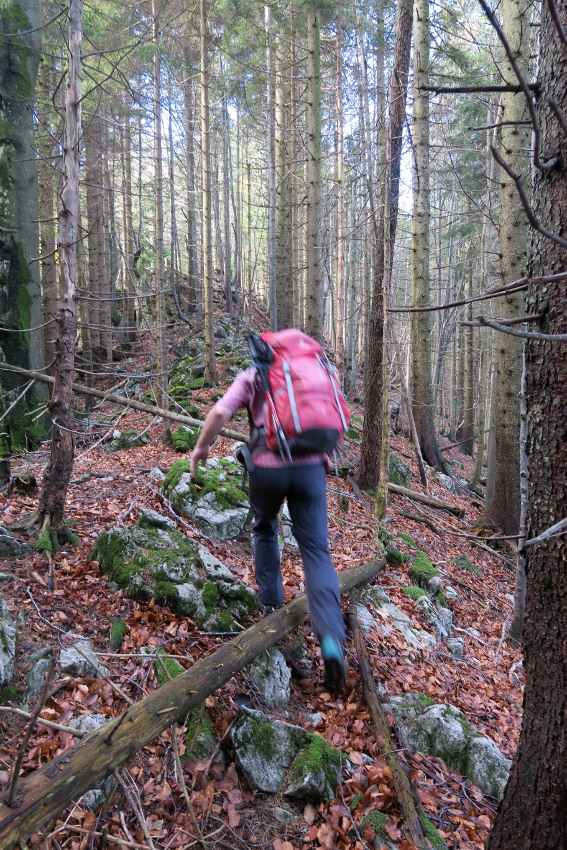 Dann ging's ab in die Botanik. Der anfangs noch deutliche Steig verliert sich rasch im Jungwald, wird zwischendurch aber wieder sichtbar. Der Waldboden war zwar von den Regenfällen der Vortage nass, aber nicht zu rutschig. So konnte man sich von Baum zu Baum nach oben schwingen. Günter fand kurz darauf den alten Steig wieder, kaum fußbreit, aber mit leidlich ausgeschnittener Schneise im Unterholz.