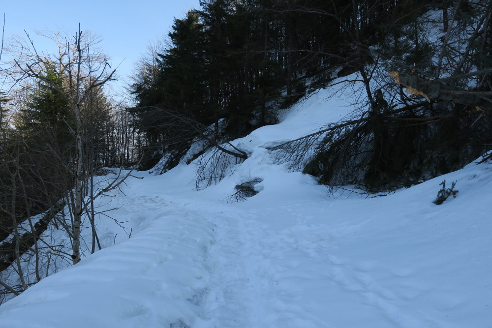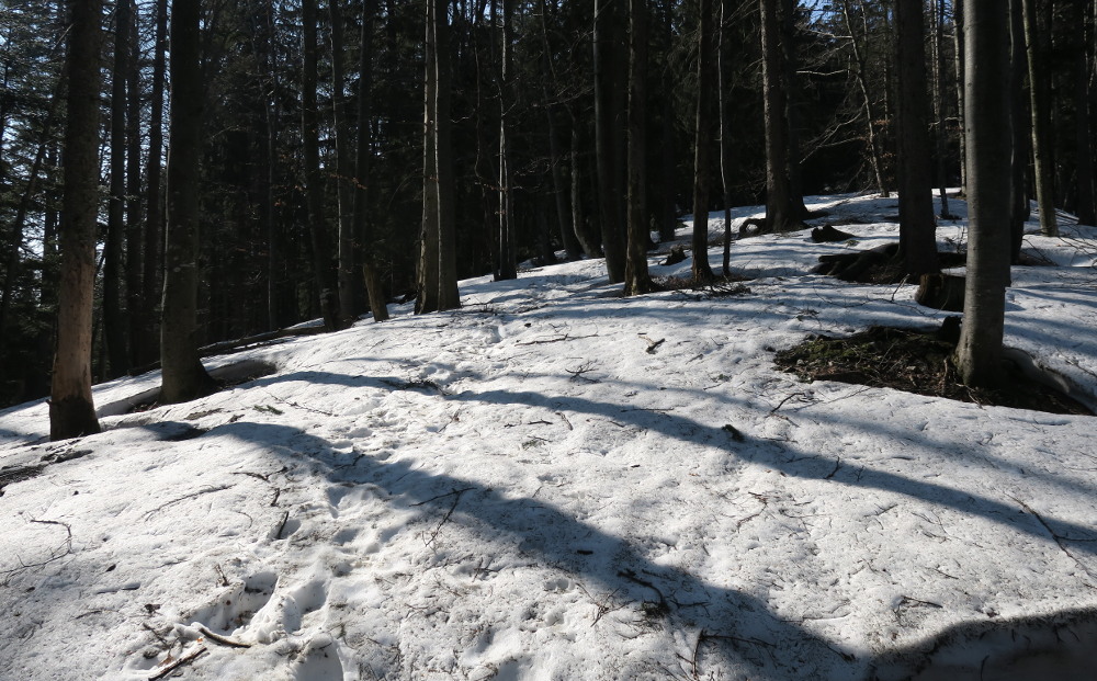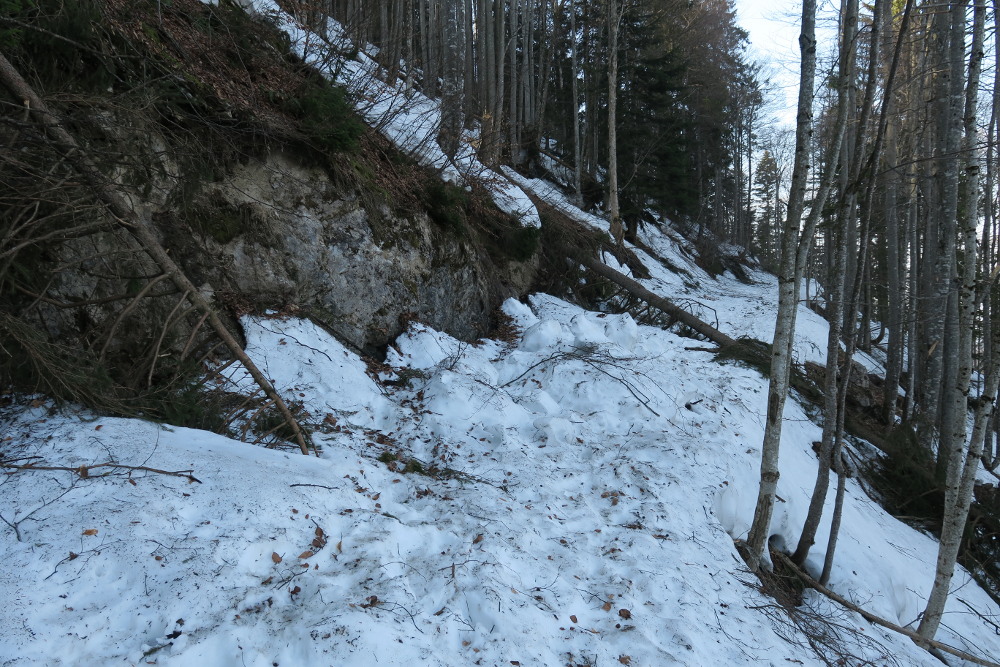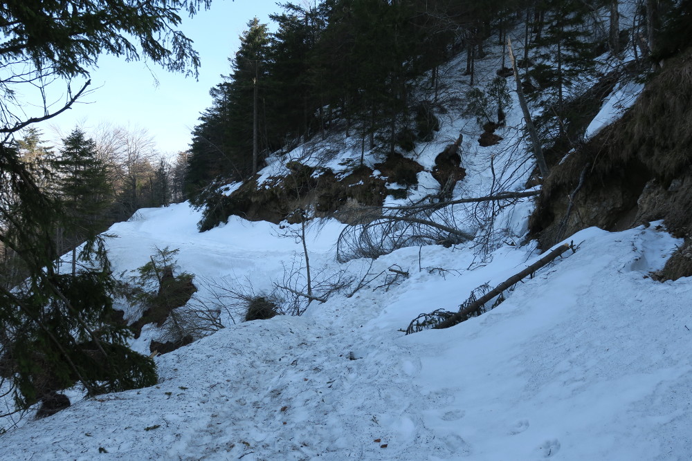 Die Lawinengefahr war gering, wenn auch nicht Null. Das anhaltende Tauwetter hat unter dem Altschnee Hohlräume entstehen lassen, die sukzessive einbrechen. Überall tropft es, das Wasser erzeugt einen schmierigen Film auf dem Erdboden, auf dem die Wechten und Altschneereste abgleiten können. Derzeit ist der Weg noch stabil, mit einer Gruppe würde ich hier aber nicht gehen wollen.