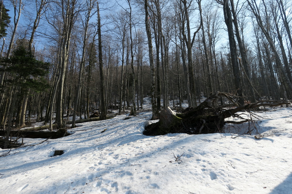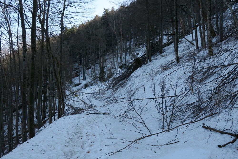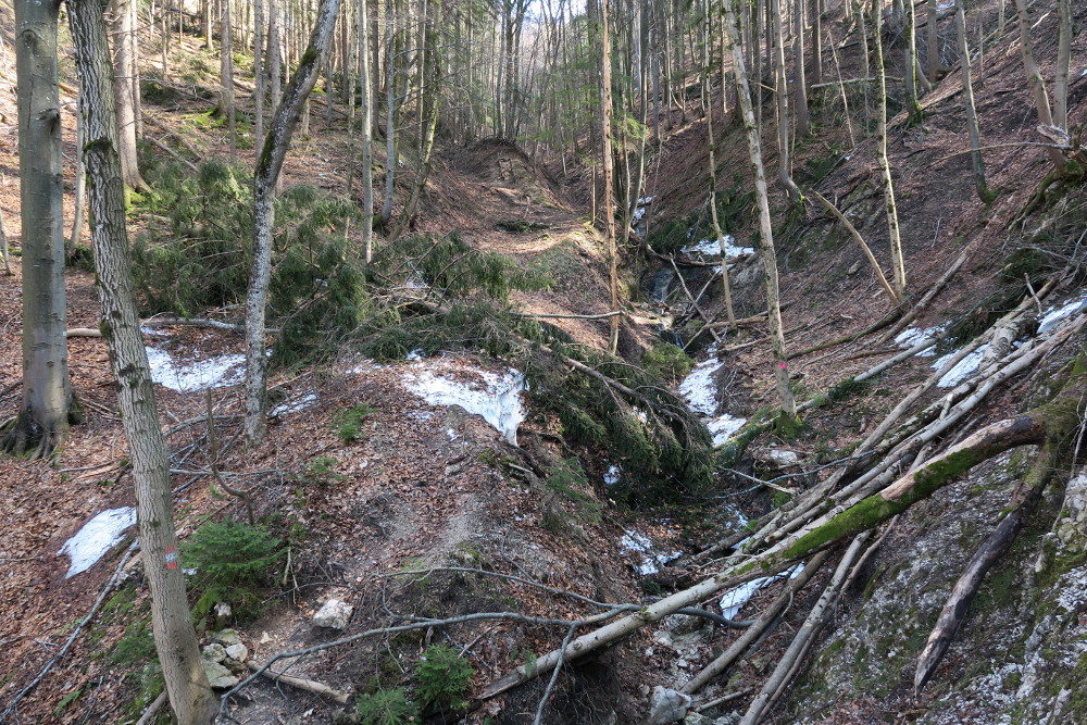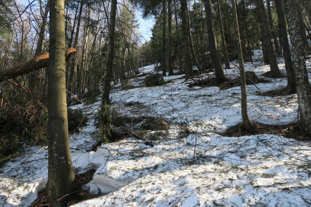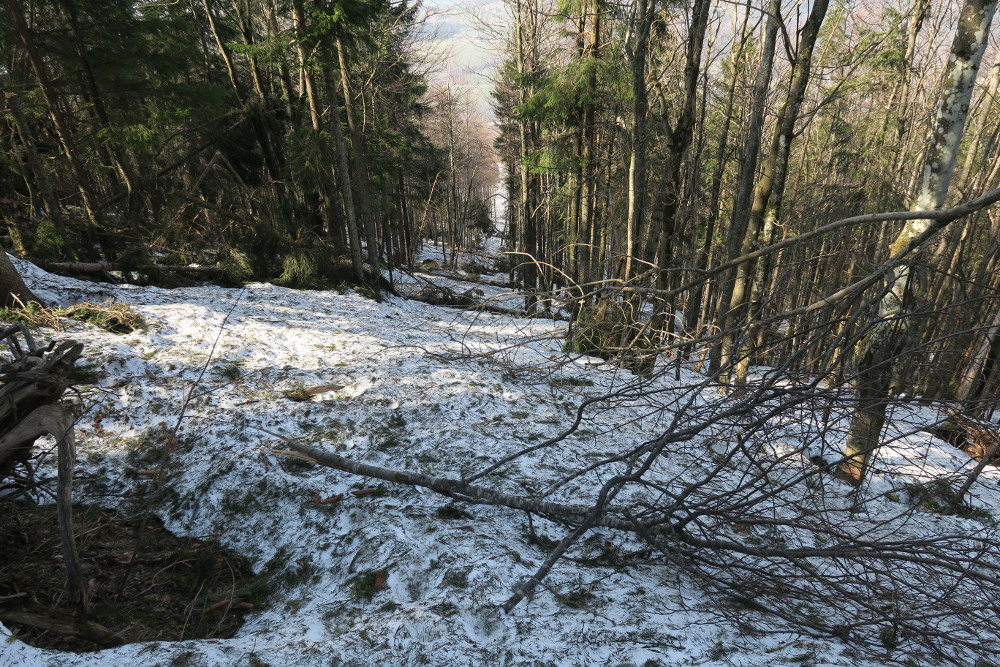 Der erste Graben noch deutlich vor der Nocksteinschlucht. Viel Windwurf. Bis zum Nockstein kommen von dieser Seite her noch einige abschüssige Hänge, das könnte gemeinsam mit dem Altschnee und Windwurf durchaus heikel werden. Ich beschloss zurückzugehen.