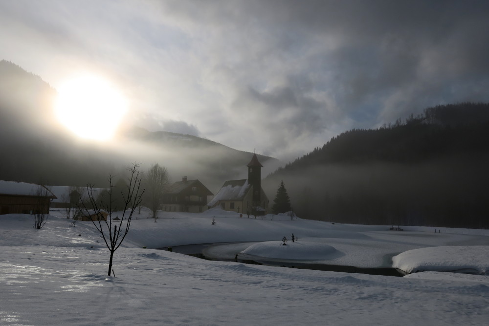 Bild 1: Sonnenstrahlen und Nebel in der Frein, mit Klemenskirche.