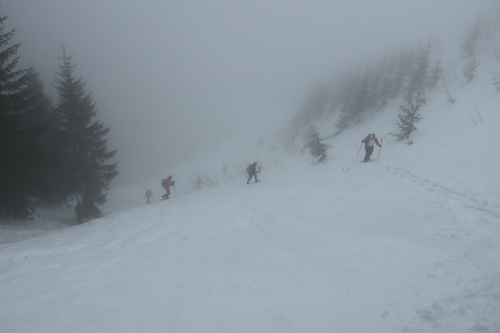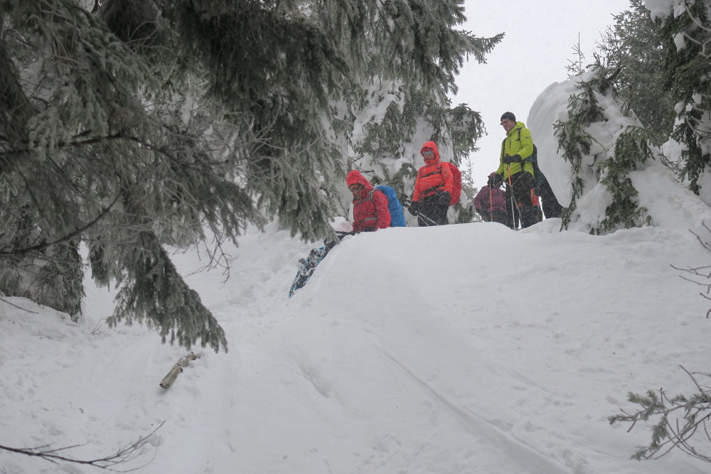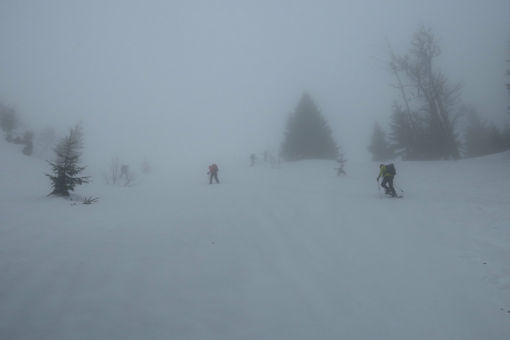 Zu weit durften wir nicht absteigen, da weiter unten Felsen und eine steile Rinne warteten. Also wieder eine Querung im Slalomlauf um eingewehte Bäume mit mächtigen Windkolken hinüber zu der freien Fläche, über die wir aufgestiegen sind.