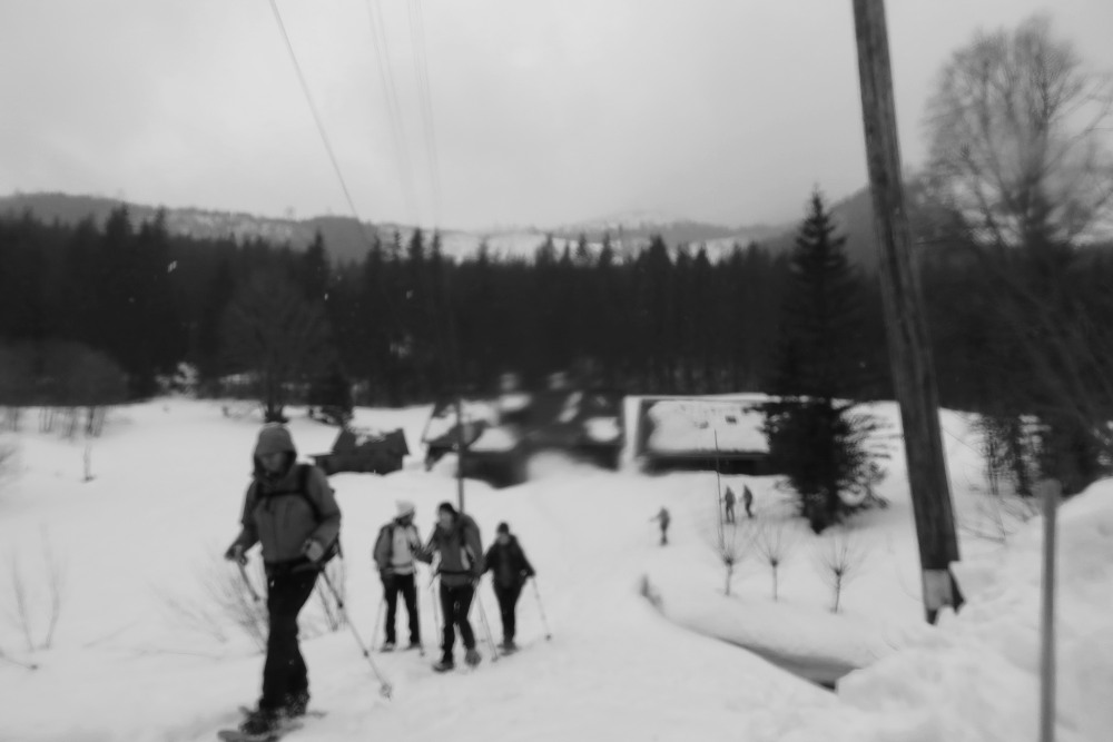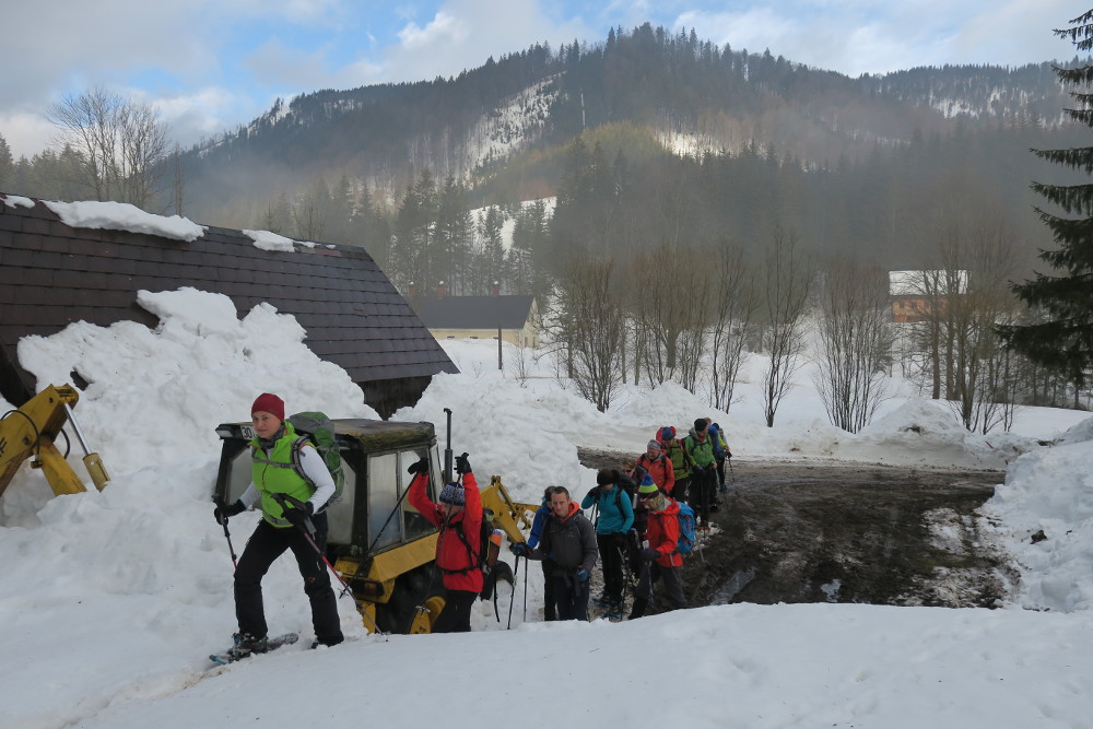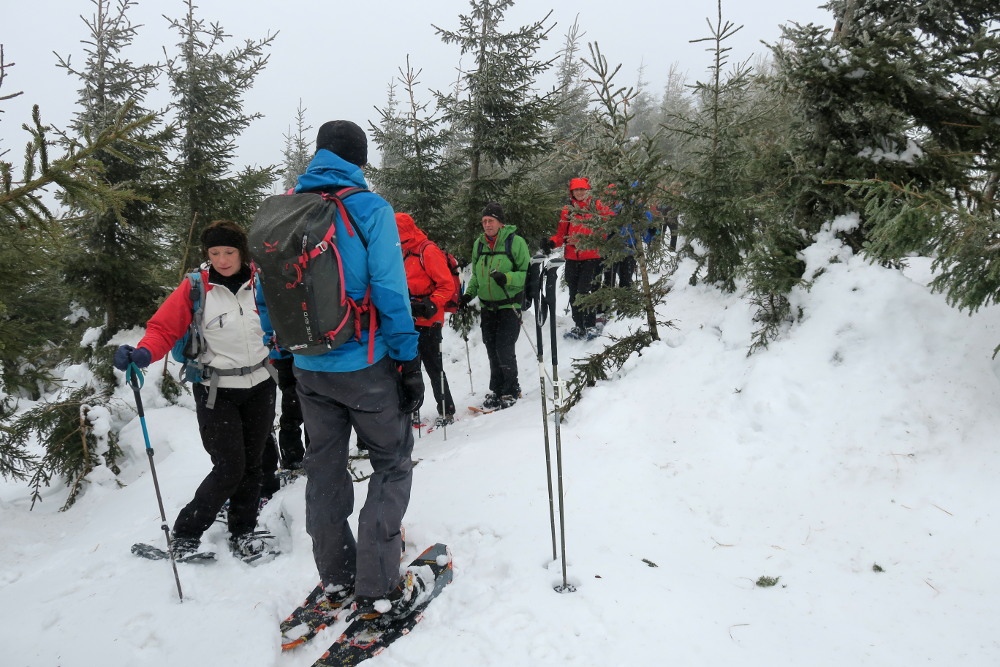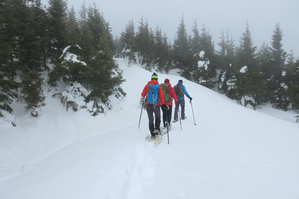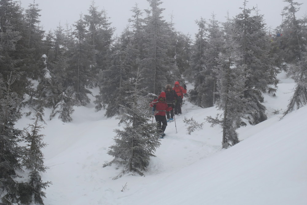 Unterwegs trafen wir die Tourengeher wieder. Zufällig hatte ich meinen Flachmann dabei und konnte eine Runde ausgeben. Für Interessierte zur Info: Es handelte sich um eine slowakische Spezialität aus der Hohen Tatra, sogenannten Tatra Tea, ein mit Schwarztee angesetzter Likör in unterschiedlicher Stärke. Hier ein Kräuterlikör mit 35% Alkohol (dunkelgrüne Flasche).