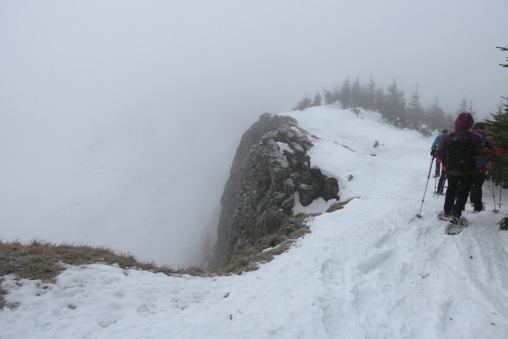 Wir bleiben meist rechts der Abbruchkante, an wenigen Stellen wird es ausgesetzt. Problem sind auch hier die massiven Triebschneeablagerungen, sodass die Gipfelwechte einige Meter ins Luv versetzt wurde, und nicht über die Kante hinaus wie sonst üblich. Unter den Jungfichten befanden sich teilweise tiefe Hohlräume. Konzentriertes Gehen war gefragt. Das kleine Gipfelkreuz war auch fast vollständig eingeschneit.