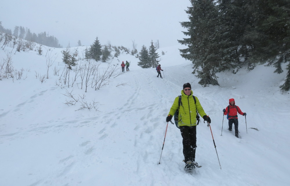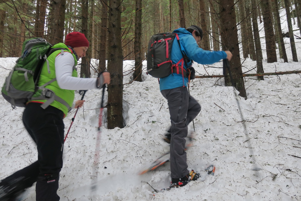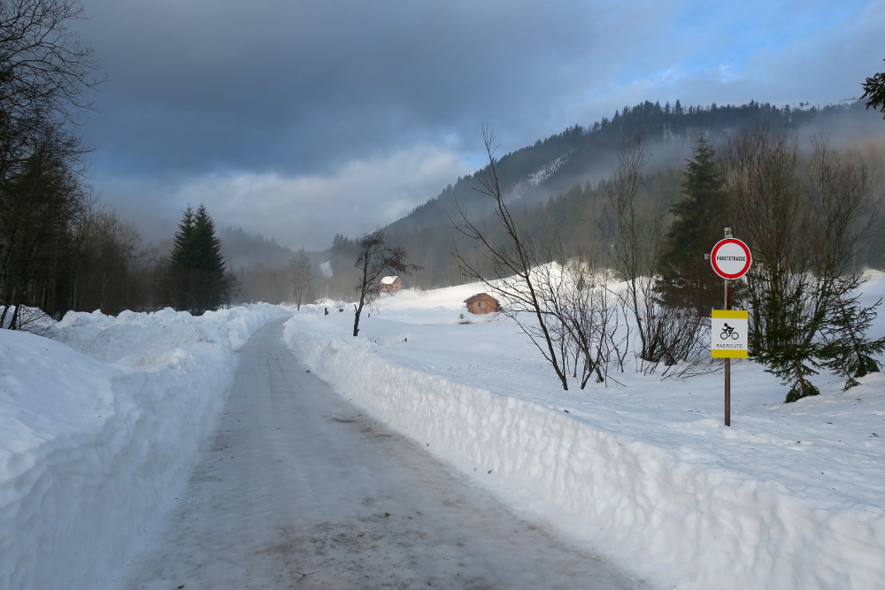 Da war es gscheiter, die Schneeschuhe schon anzulegen. Die Wolken lockerten unterdessen auf. Mein trockener Kommentar: Der Wind kommt aus der falschen Richtung. Es herrschte nämlich weiterhin Südwestwind in der Höhe. Irgendwann im Tagesverlauf sollte es kälter werden mit auflebendem Nordwestwind. Unklar war nur, wann genau das geschah. Bis 9.00 Uhr kam die Kaltluft schon bis Mariazell voran, dort nur noch knappe Plusgrade.