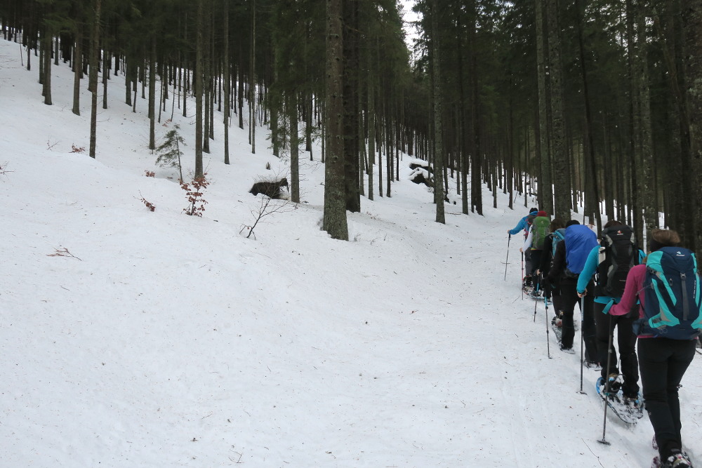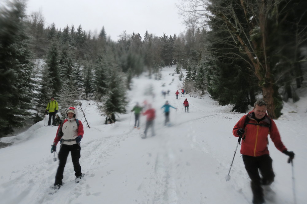 Von dort zurück zum Ausgangspunkt. Wie die Tourengeher später berichteten sahen sie aus der Nähe einen großen Hirsch. Ich sah ihn auch, nämlich im Bachbett langsam vorausgehend. Als er die Gruppe Schneeschuhwanderer hörte, stoppte er. Ich sah ihn kurz aus der Nähe, er mich leider auch, ehe ich die Kamera zücken konnte, und er ging zurück. Wegen der hohen Schneewälle zur Straße hin ist der Hirsch sonst niemandem aufgefallen.