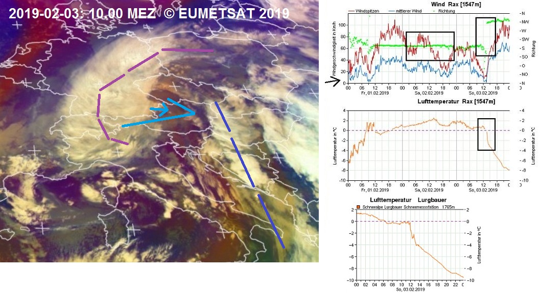 Rechts der Windsprung um die Mittagszeit auf der Rax, verbunden mit dem Temperaturrückgang, etwas früher auf der Schneealm (Lurgbauer), das etwas westlicher liegt.