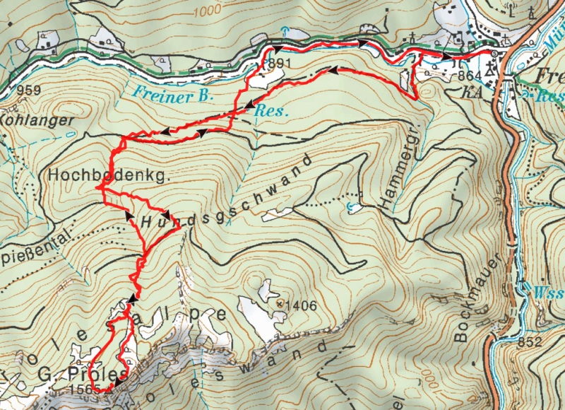 - Wegführung: Frein (9.10) - Hammergraben - Hochbodenkogel (10.50) - Gipfel (12.20) - retour (14.45)