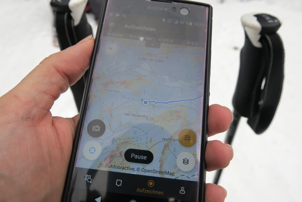 Farbig eingezeichnet über 30 Grad Hangneigung. Im Gegensatz zur Apemap App sieht man ohne Umschalten immer die aktuellen Daten eingeblendet, inklusive Standorthöhe. Größter Nachteil ist jedoch, dass bei einem eventuellen Absturz der App der Track nicht zwischengespeichert wird.