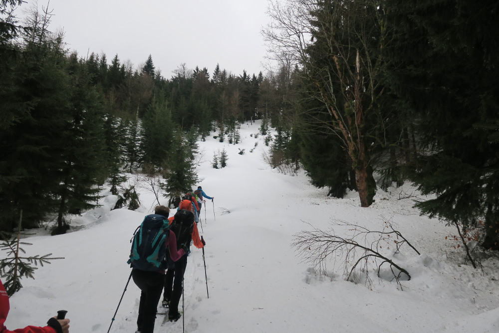 Bild 10: Zunehmend steil über lichten Jungwald hinauf zu einem Forstweg, der durch Triebschneeablagerungen im weiteren Verlauf zur schrägen Ebene wurde.
