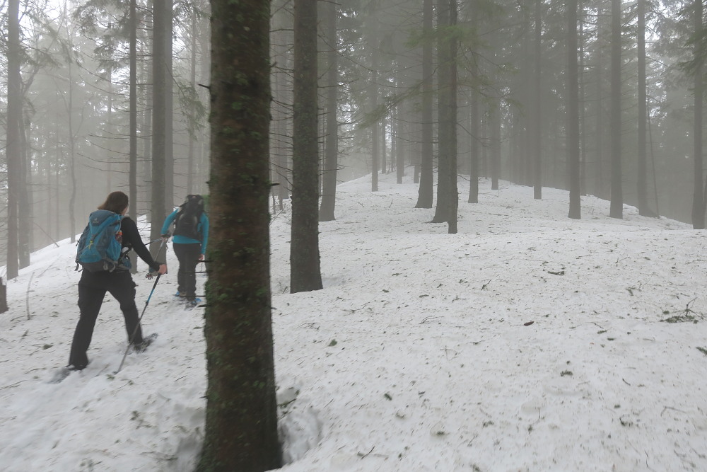 Zweiter Tag nach Übernachtung im Freinerhof, sehr gutes Essen. Schweinefilet mit Pfeffersauce und Kroketten, dazu grüner Salat. Am Nachmittag zuvor ein Apfelstrudeluboot ertränkt in Vanillesoße. Man gönnt sich ja sonst nichts. Auch das Frühstück umfangreich mit Eiern zum selbst Kochen. In der Früh regnete es noch ein wenig, also immer noch Tauwetter. Das ursprüngliche Ziel Veitsch wurde kurzfristig umdisponiert in Prolesalpe, was den Vorteil hatte, dass wir direkt vom Quartier starten konnten.