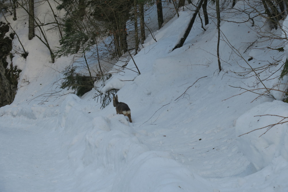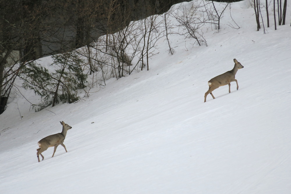 Bild 1: Schon vorm Start staksen insgesamt drei Rehe über den verschneiten Hang aufwärts.