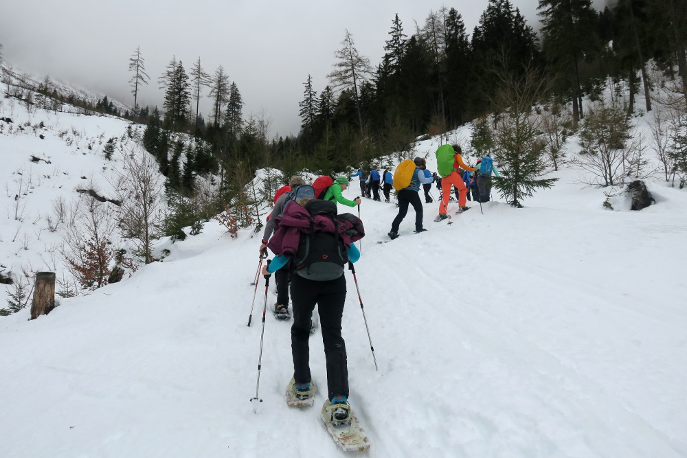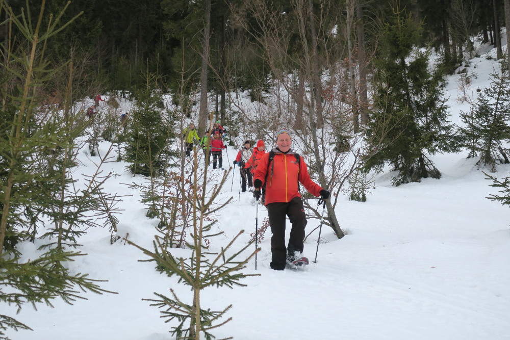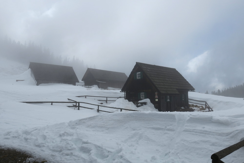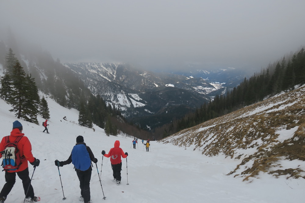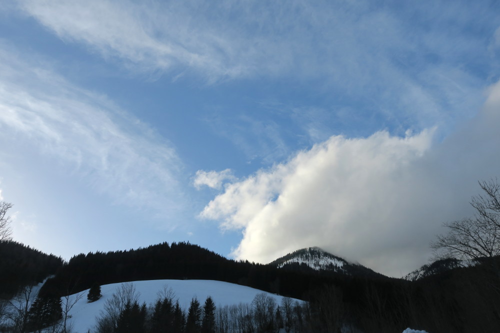 Zwei Tage Schneeschuhwandern mit Csaba und Gruppe vom Alpenverein. Start am Samstag in Krampen bei Neuberg an Mürz. Vom Wetter her Glück im Unglück. Zwar sehr mild, aber kaum Niederschlag. In Wien kletterte das Thermometer am Nachmittag auf plus 15 Grad, in Reichenau an der Rax auf plus 13 Grad. In Mariazell plus 8 Grad. In Mürzzuschlag waren es 10 Grad am Samstag und 7 am Sonntag. Bei der Hinfahrt schon beeindruckend die ausgedehnte Leewellenbewölkung über dem Alpenostrand und die Sturmböen am Semmering bzw. oberhalb von Steinhaus. Dann Regen im Mürztal, der beim Frühstücksstop in Neuberg an der Mürz schon weniger wurde.