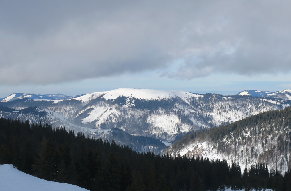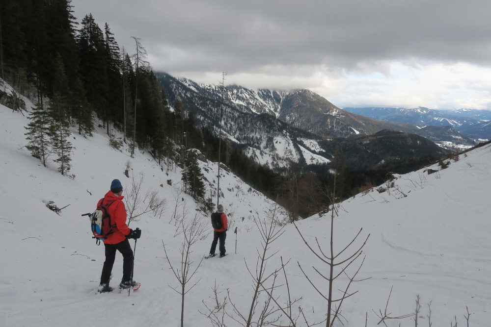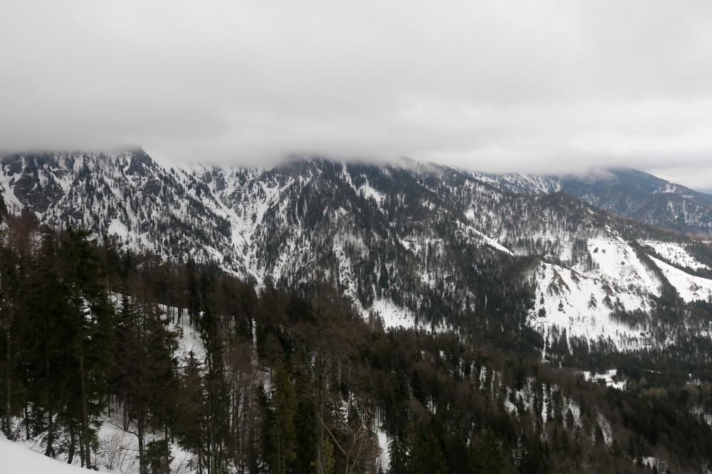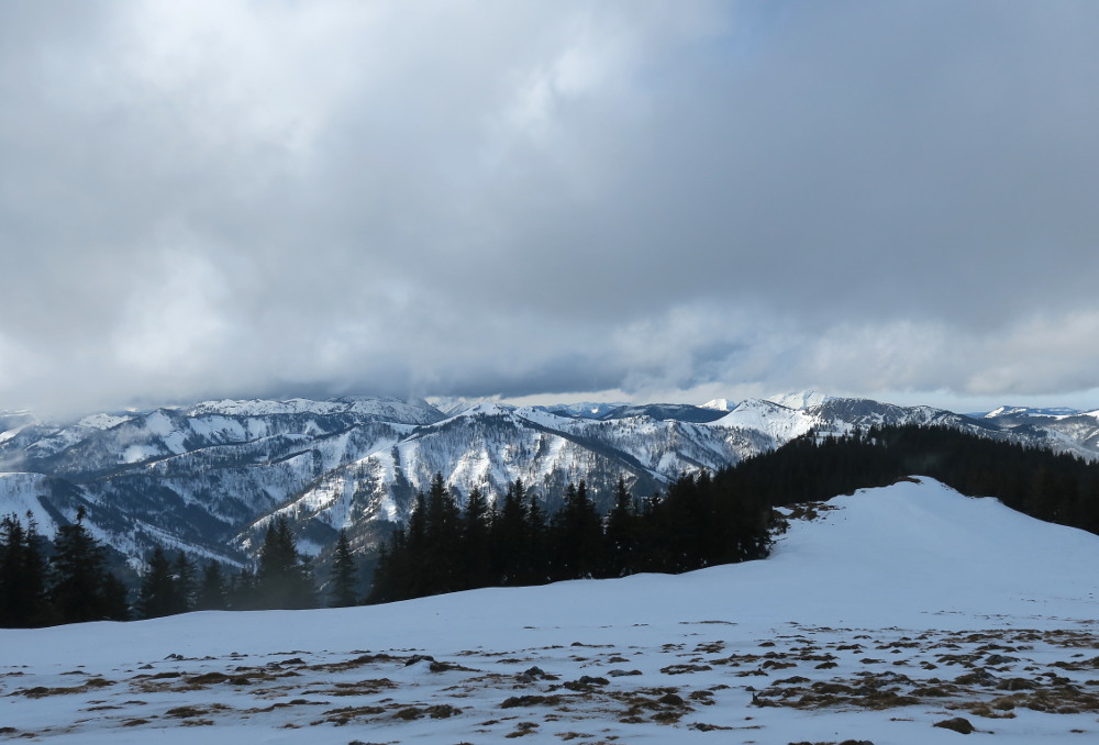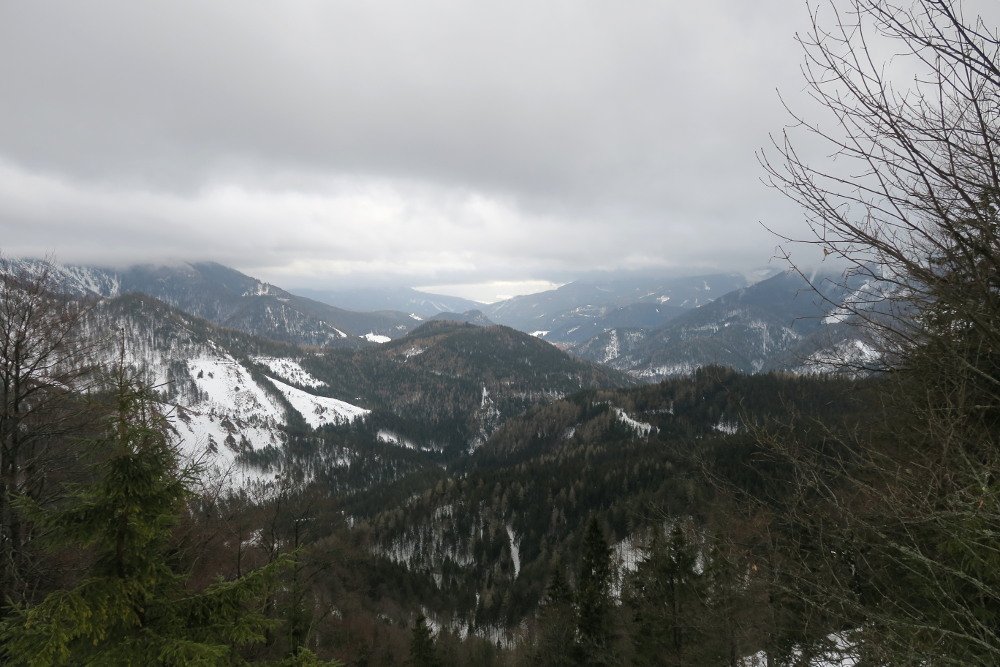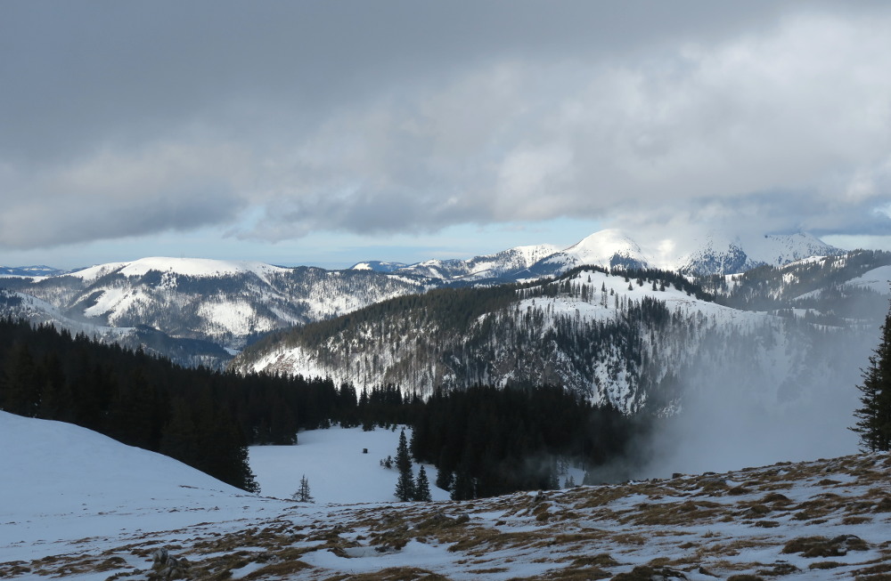 Bildmitte: Großer Königskogel (1574m), weiter rechts mit verschneiter Südflanke Kleiner Proles (1579m) und mit dem bewaldeten Kamm rechts (1565m), unser Ziel am Folgetag. Dahinter schauen auch noch Gemeindealpe (1626m) und Ötscher (1893m) heraus.