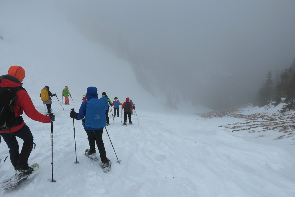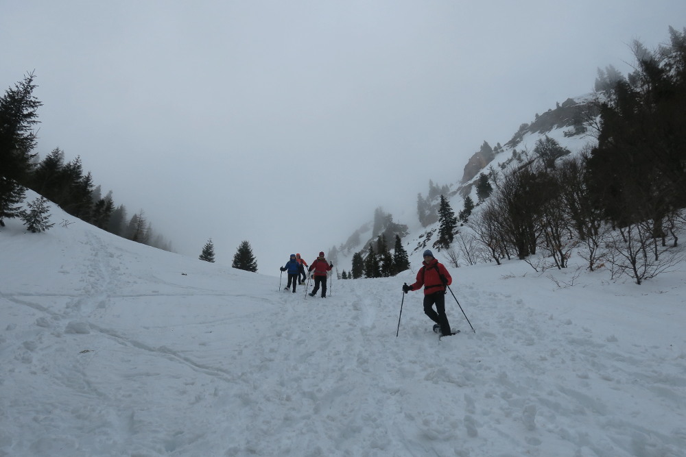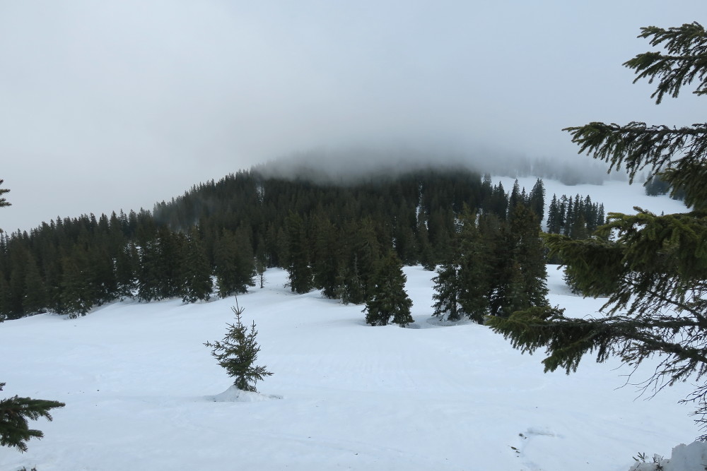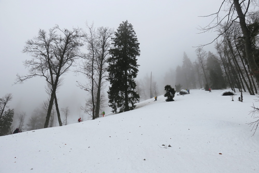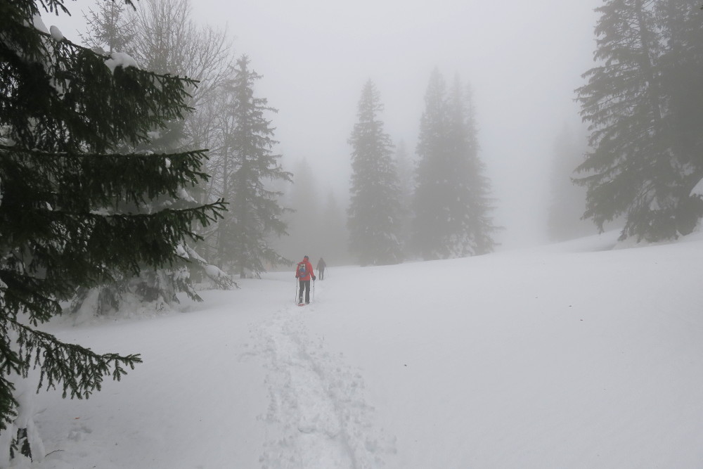 Bild 9: Auf besagter Wiese ist die Schneequalität sofort besser, dafür sind wir mitten im Nebel, jedenfalls vorerst.