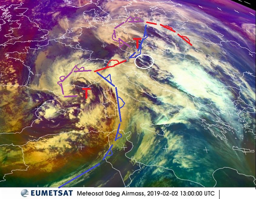 Weiter nördlich über Tschechien schließt das nächste Tief an, die zugehörige Okklusion staut von Nordwesten gegen das Erzgebirge und sorgt für einiges an Neuschnee. Der Osten und Südosten Österreichs einschließlich Mürzsteger Alpen liegen - im weiß eingekreisten Bereich - im Niemandsland zwischen den Fronten, wo die Wolken in allen Höhen deutlich auflockern.