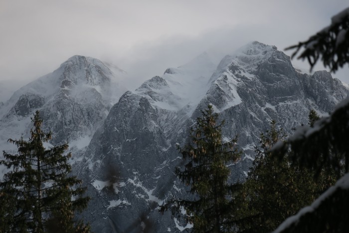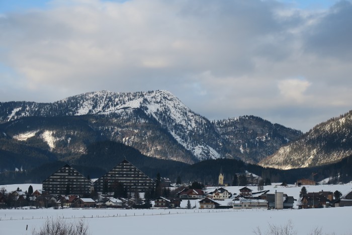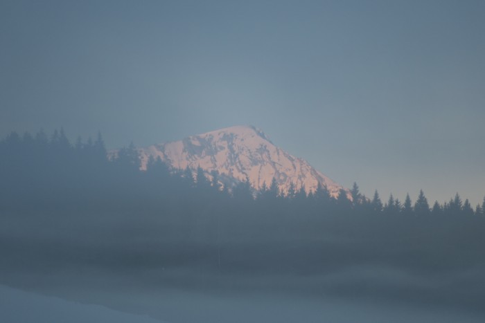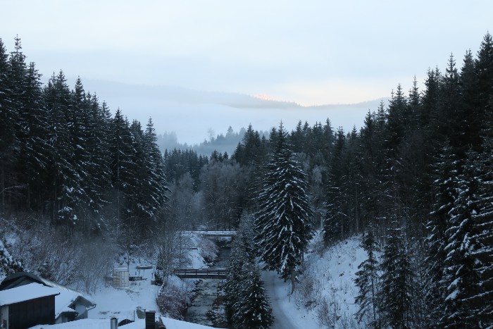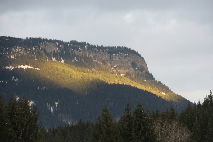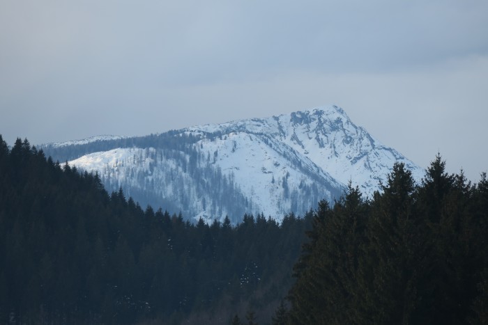 Bild 1: Zimmerblick für 3 Wochen, unten gefrierender Nebel, leuchtender Ausseer Zinken (1854m) in der Morgensonne.