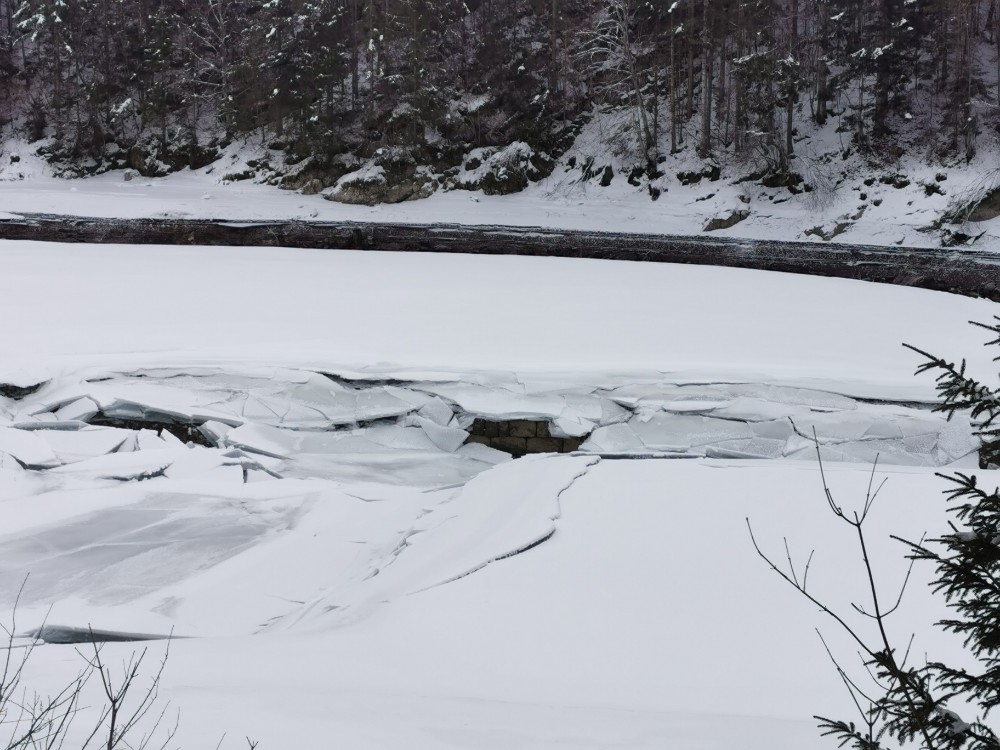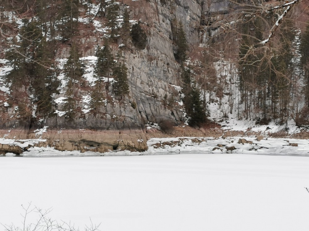 Leider habe ich keine historischen Bilder des Taleinschnitts vor der Flutung gefunden. Der Spiegel des Sees ist innerhalb 18 Tagen um gut drei Meter abgesunken, wobei unklar ist, ob abgelassen wurde oder ob das alles alleinig dem strengen Frost zuzuschreiben ist. Alle Bilder mit dem Handy.