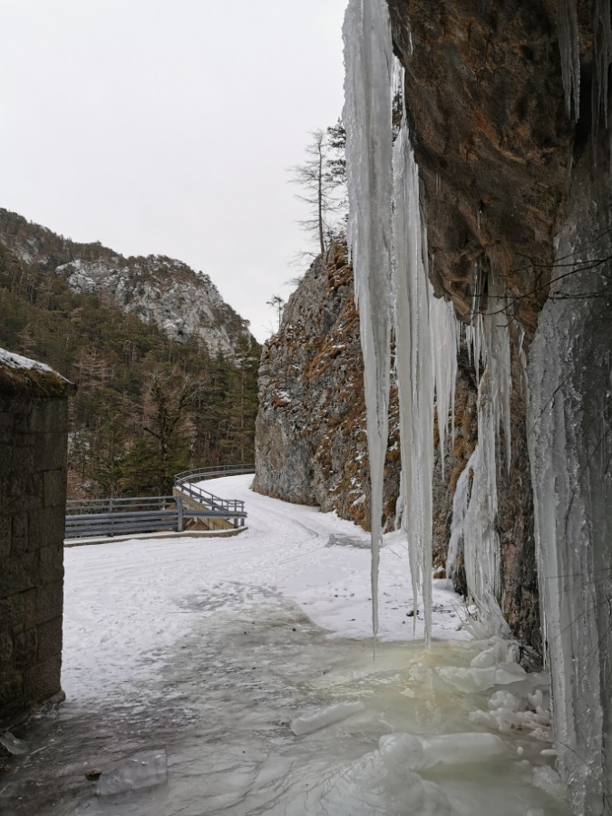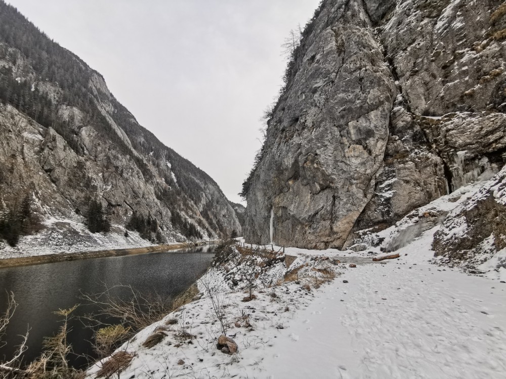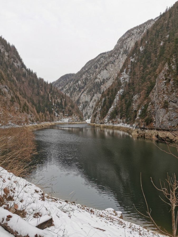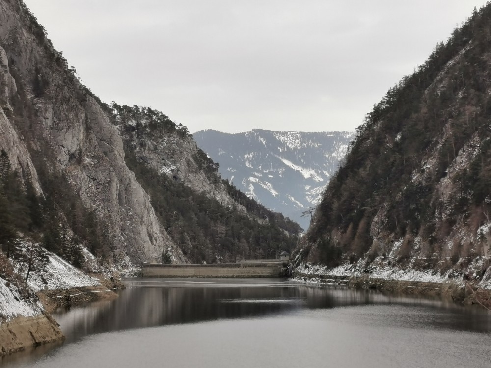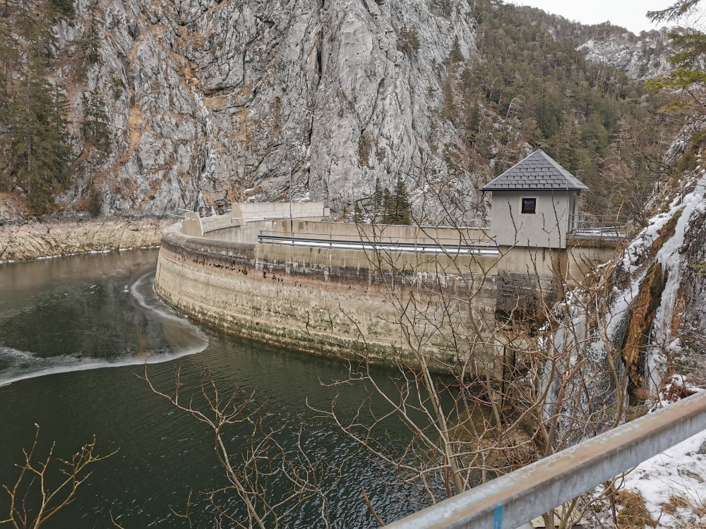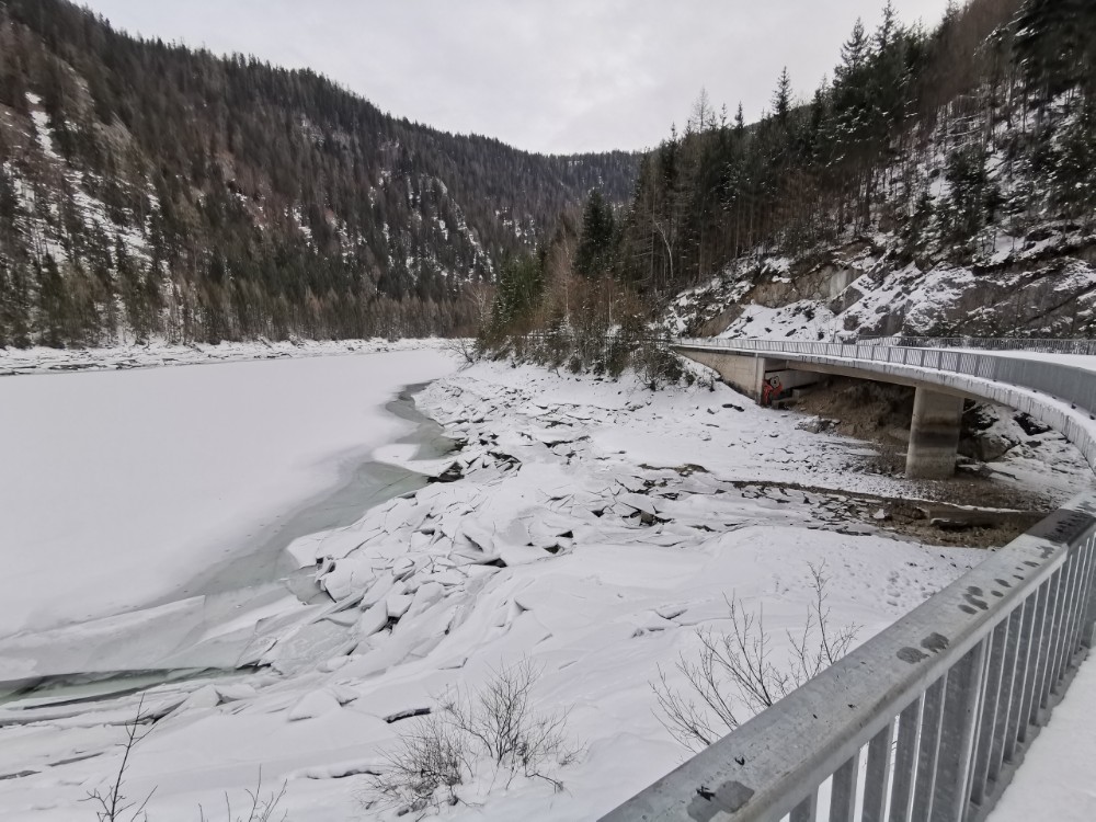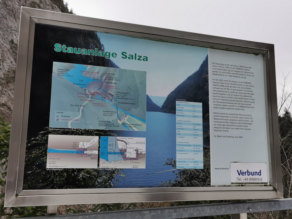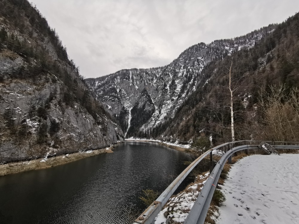 Drei Tage vor der Rückfahrt nach Wien ging ich gemeinsam mit einem anderen Kurgast den Salzastausee entlang. Große Teile der ehemaligen Pass-Stein-Straße, die am 1947 bis 1949 errichteten Stausee entlang führt und 2003 wegen einem Felssturz gesperrt werden musste, sind bis heute für den allgemeinen Verkehr gesperrt. Begehung erfolgt auf eigene Gefahr. Einheimische nutzen die direkte Verbindung zwischen Hinterbergertal und Ennstal gerne zum Radfahren im Sommer. Bei stärkerem Tauwetter, im Frühjahr sowie bei starken Regenfällen würde ich hier nicht gehen. Wir sind sehr zügig gegangen und wenig stehengeblieben.