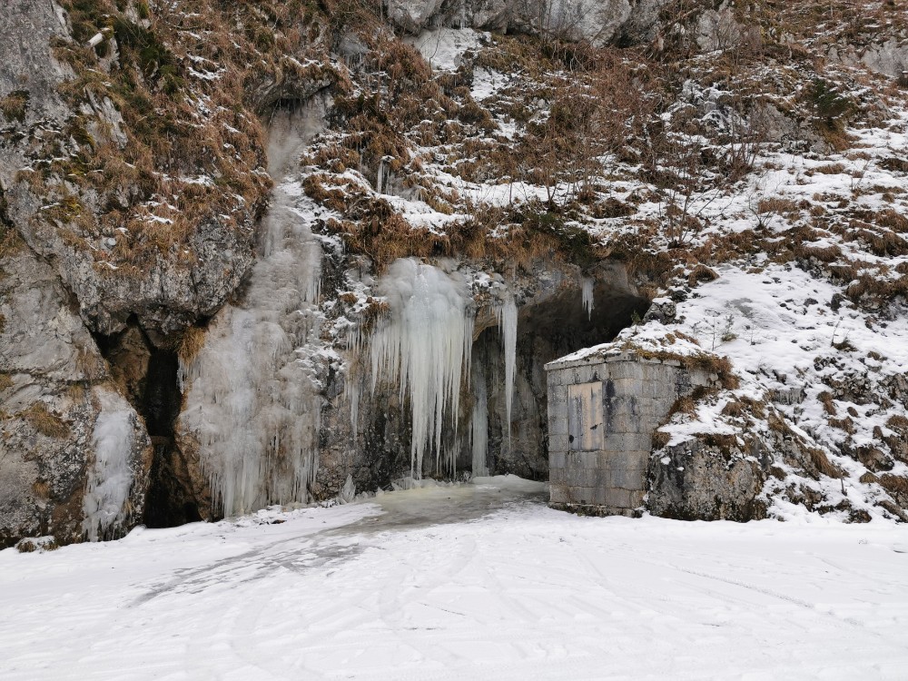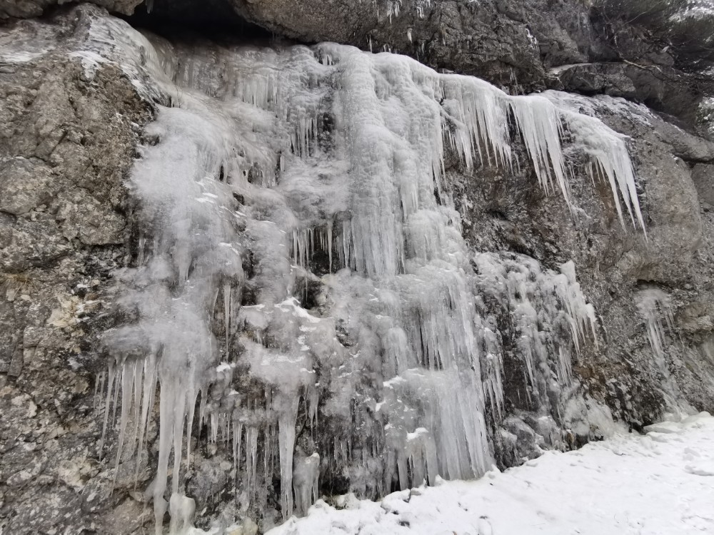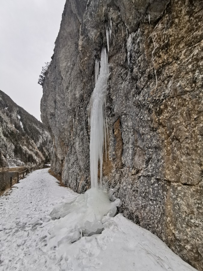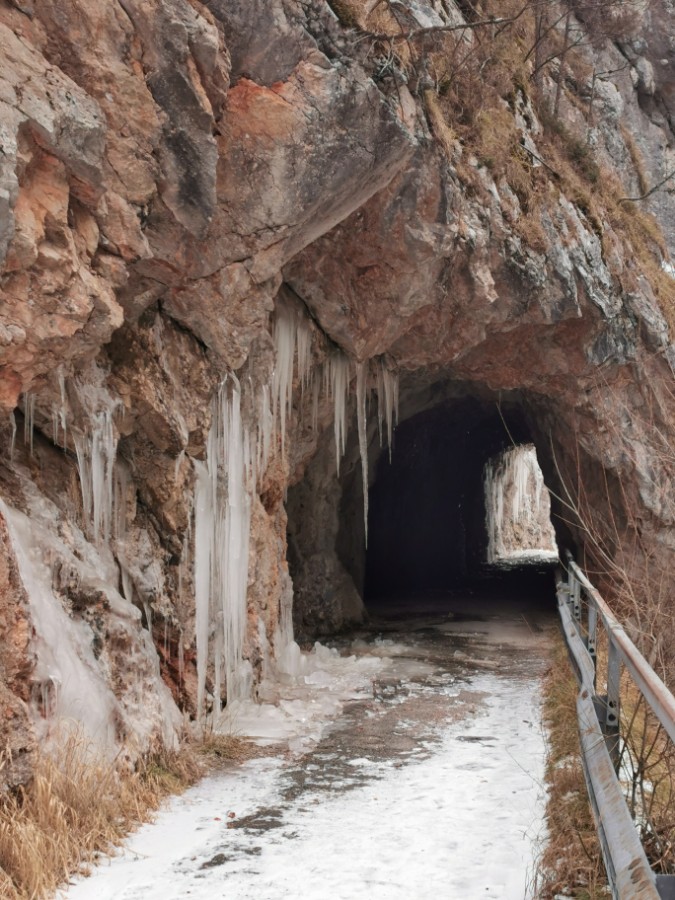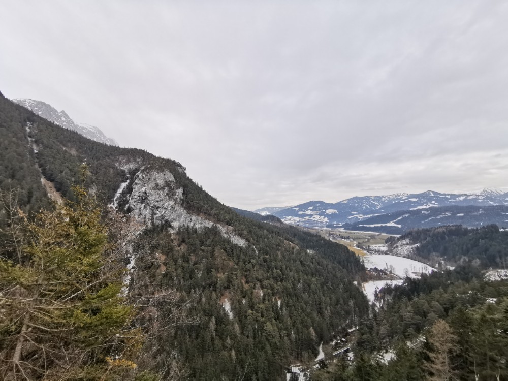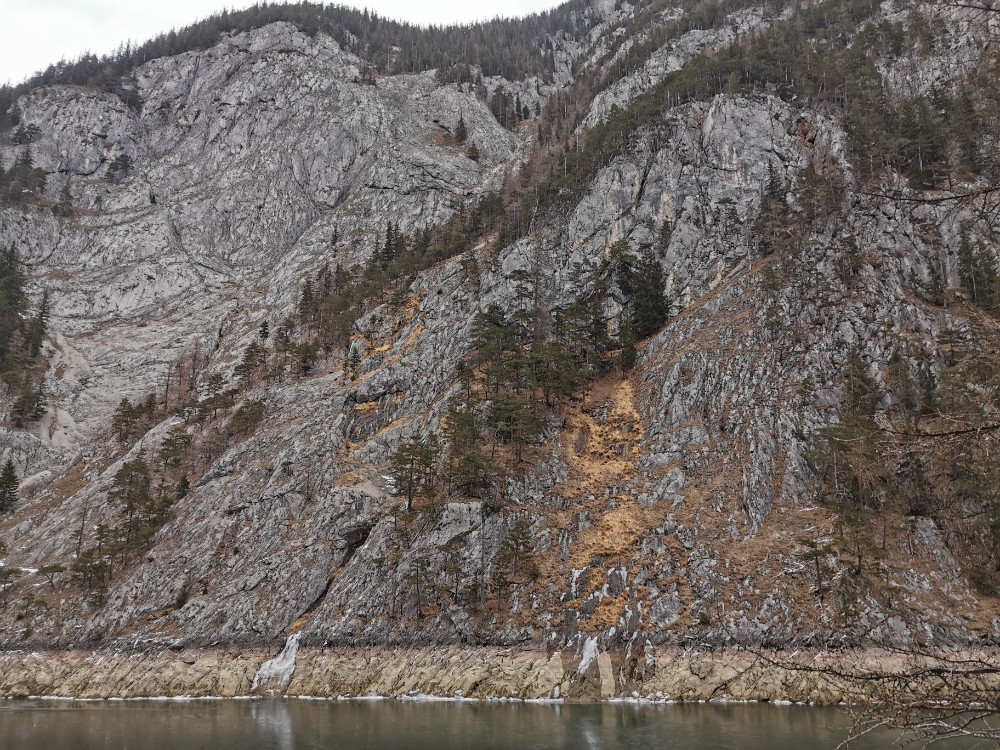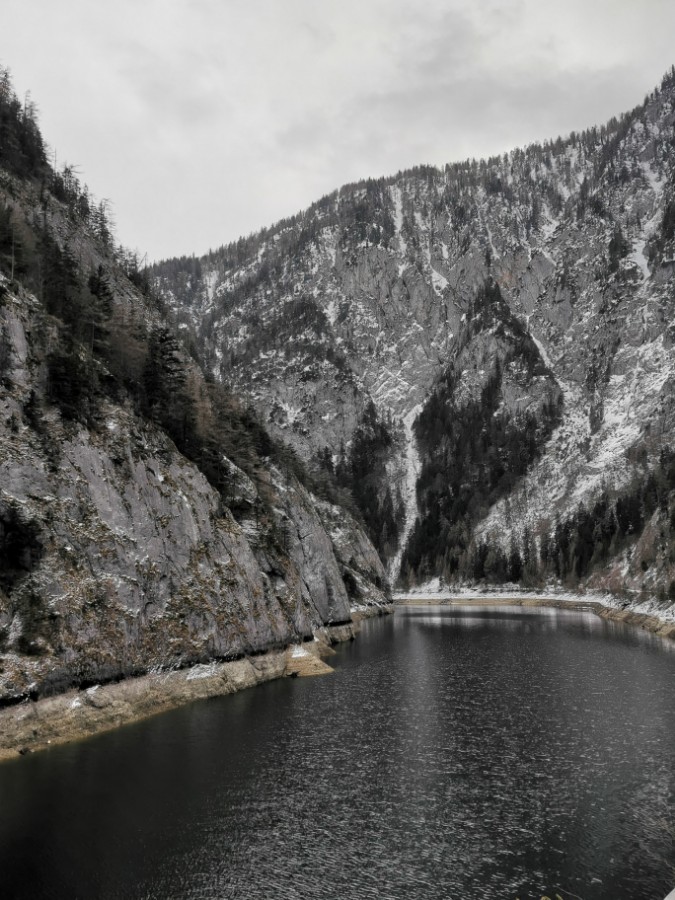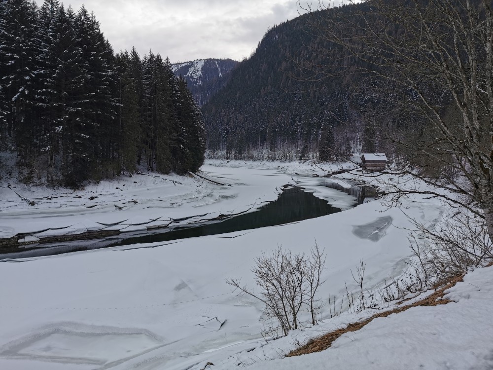 Drei Tage vor der Rückfahrt nach Wien ging ich gemeinsam mit einem anderen Kurgast den Salzastausee entlang. Große Teile der ehemaligen Pass-Stein-Straße, die am 1947 bis 1949 errichteten Stausee entlang führt und 2003 wegen einem Felssturz gesperrt werden musste, sind bis heute für den allgemeinen Verkehr gesperrt. Begehung erfolgt auf eigene Gefahr. Einheimische nutzen die direkte Verbindung zwischen Hinterbergertal und Ennstal gerne zum Radfahren im Sommer. Bei stärkerem Tauwetter, im Frühjahr sowie bei starken Regenfällen würde ich hier nicht gehen. Wir sind sehr zügig gegangen und wenig stehengeblieben.