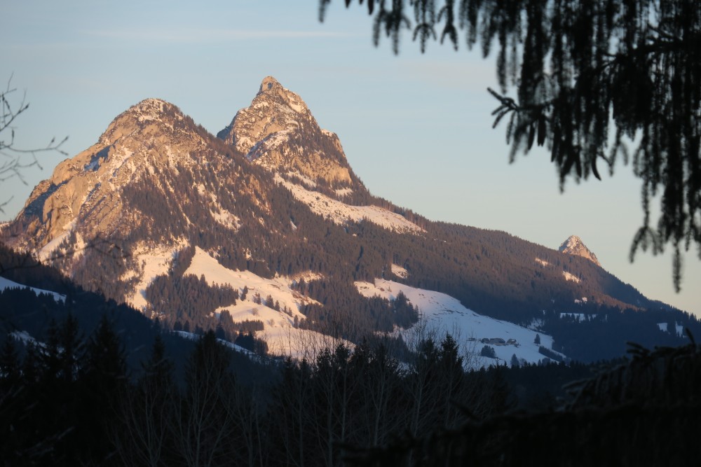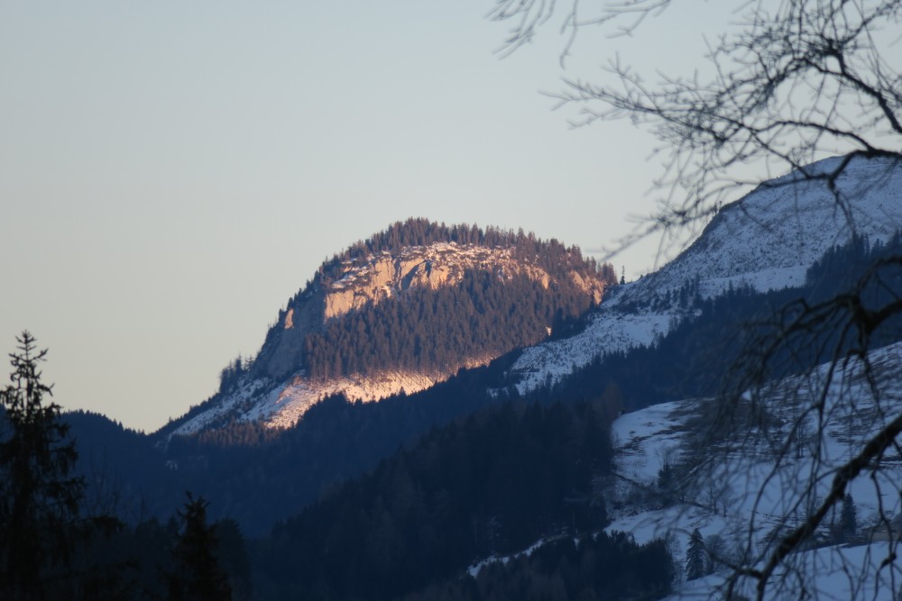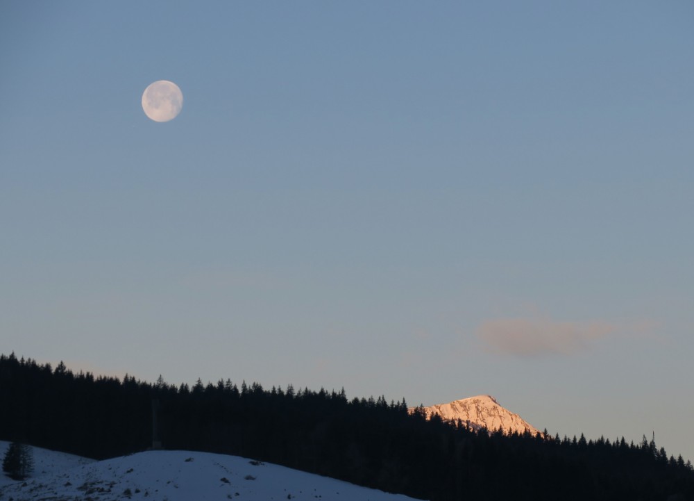 Bild 1: Zimmerblick derzeit, auf den angeleuchteten Zinken (1854m) bei Vollmond.