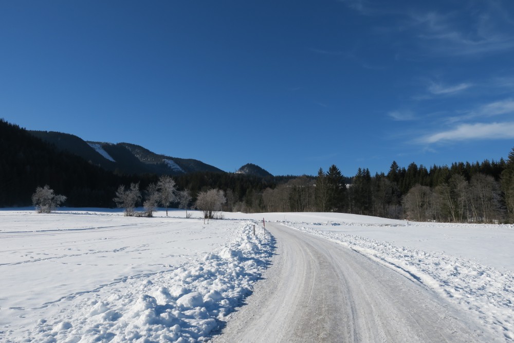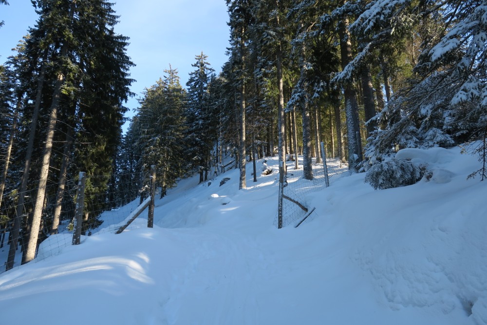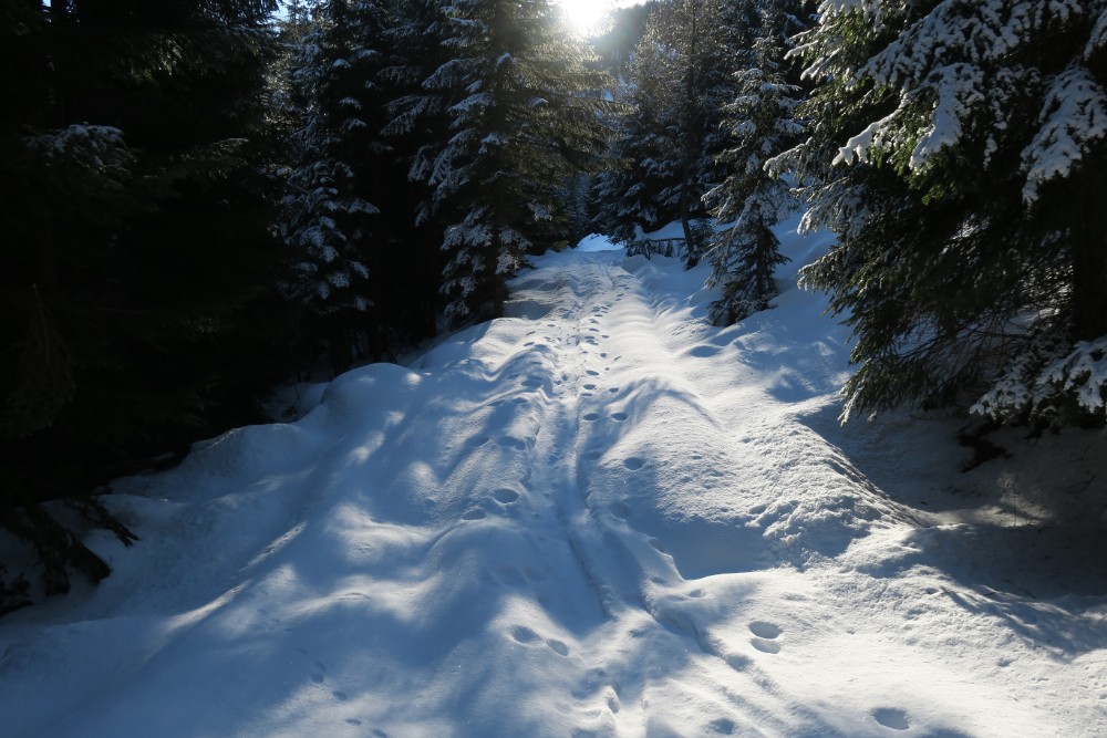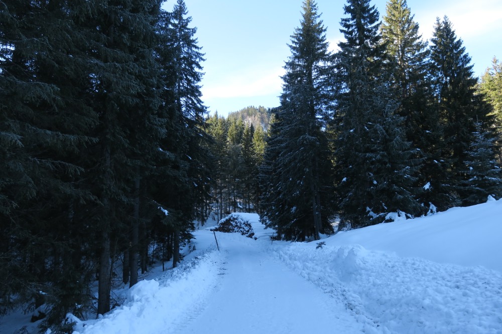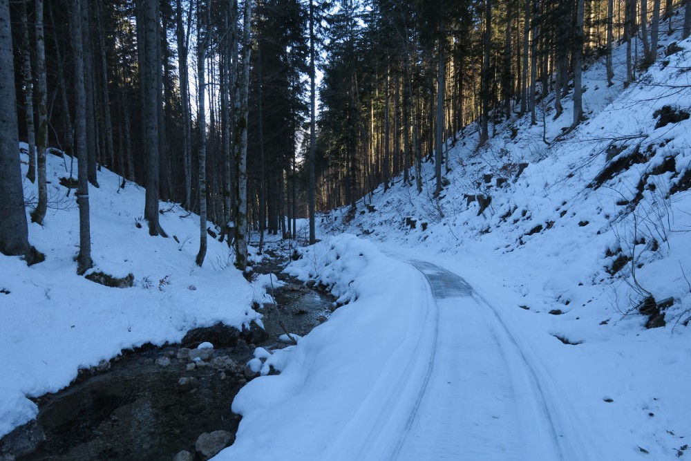 Ab Steinitzenalm war der Forstweg zwar geräumt, aber bereits ziemlich vereist. Zeit für einen Wechsel, die Spikes kamen zum Einsatz. Eine goldrichtige Entscheidung, sie mitzunehmen! So konnte ich zügig absteigen, ohne Gefahr, auszurutschen. Der Weg zieht sich ziemlich in dem engen Graben, und die Luft kühlte jetzt spürbar ab. Pausen machte ich insgesamt nur zwei, kurze Trinkpause und etwas Studentenfutter. Wanderung zwischen Mittag- und Abendessen, da brauchte ich nicht mehr.