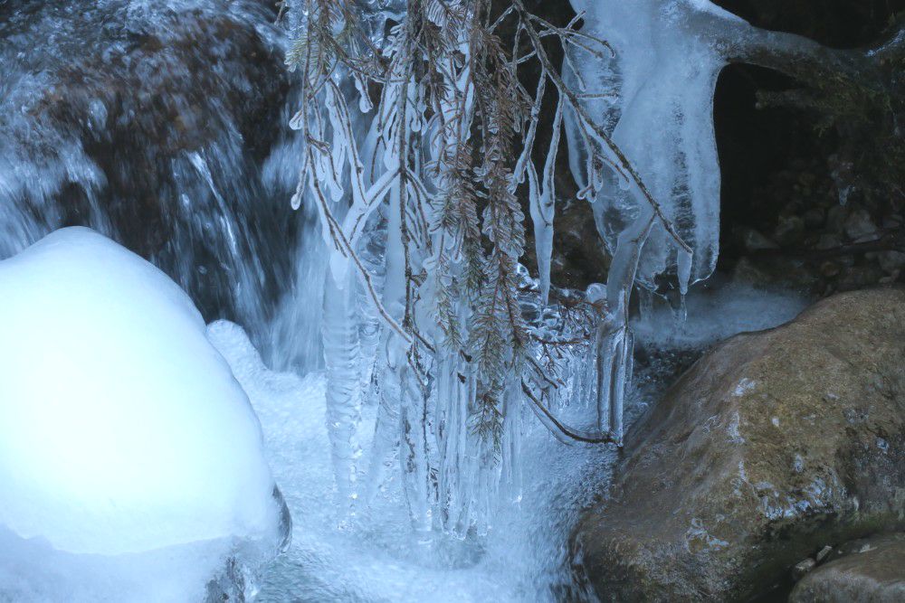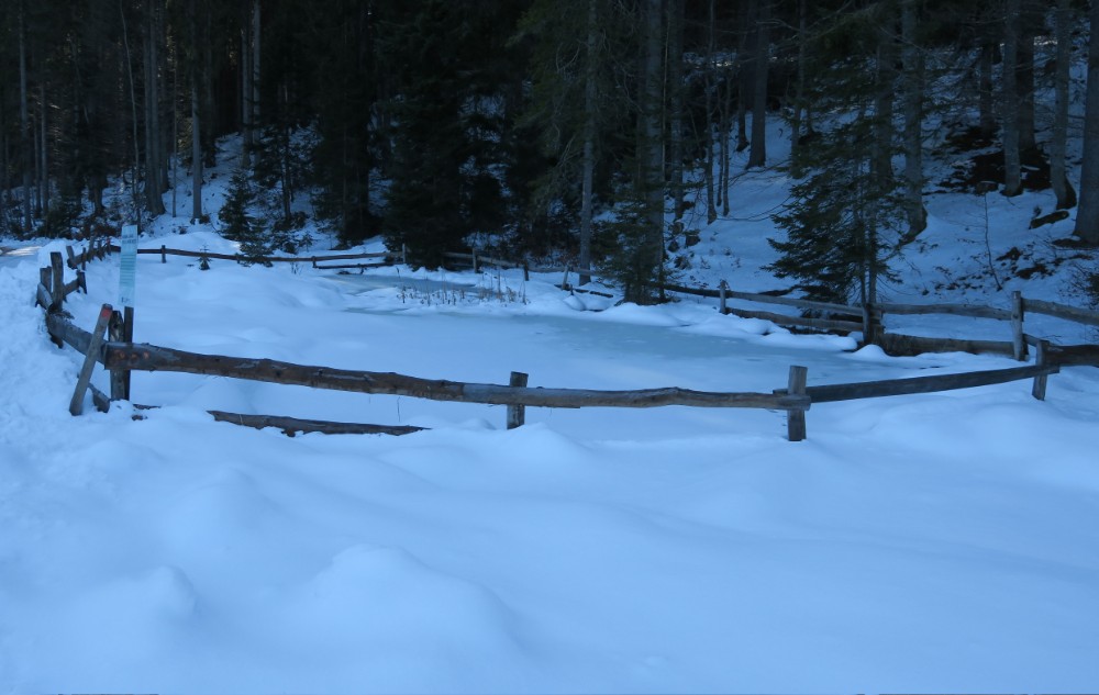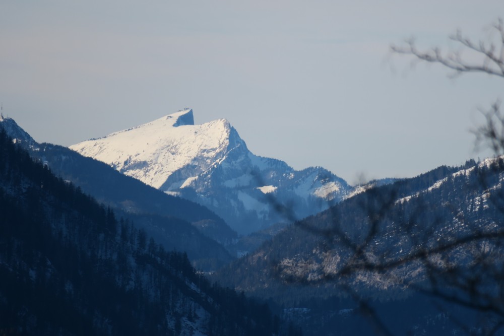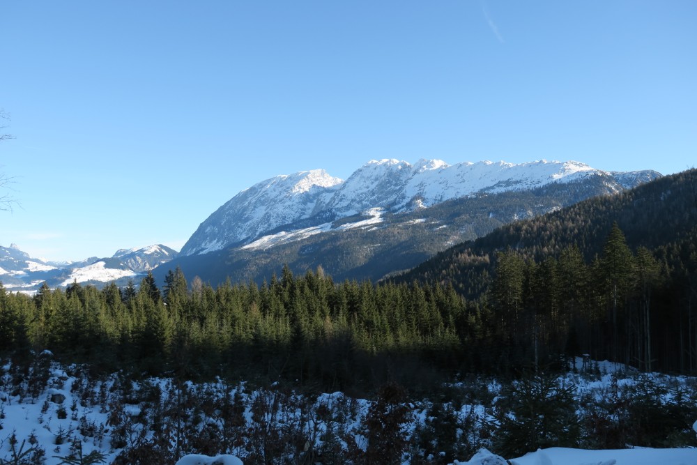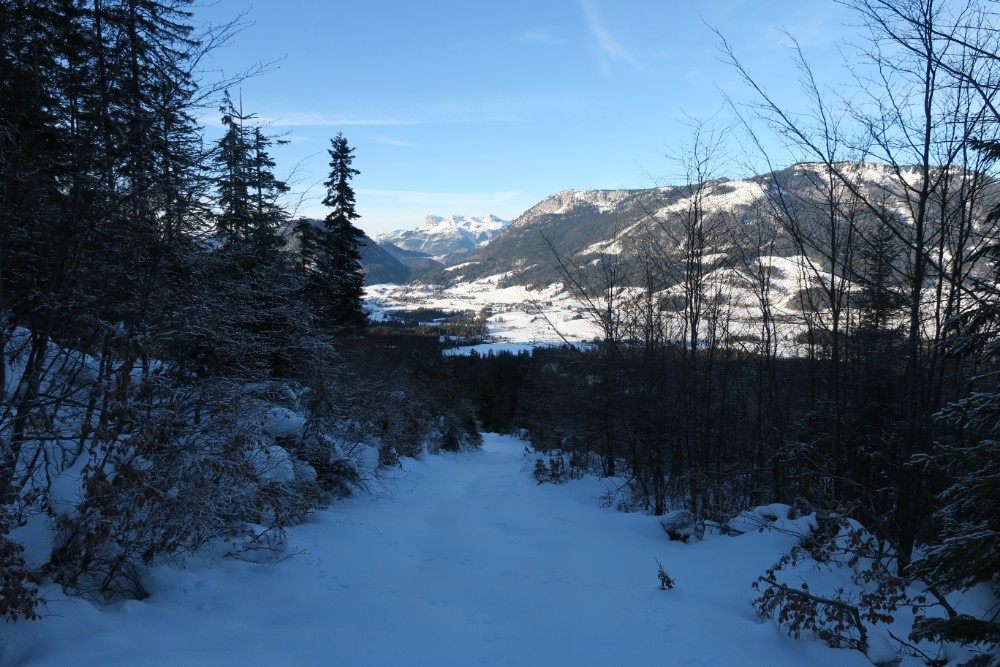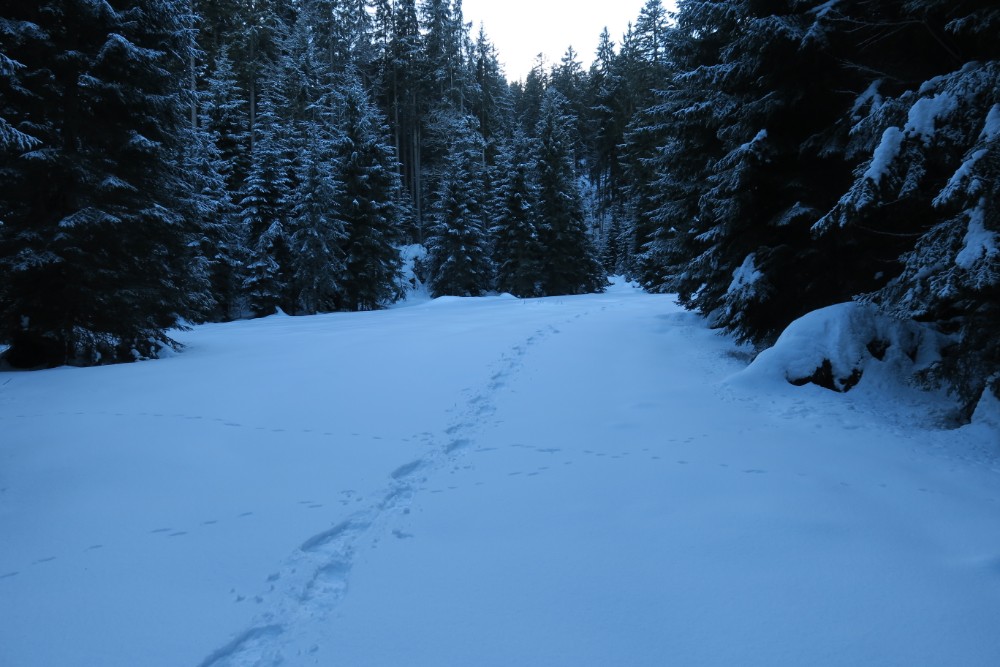 Ab Steinitzenalm war der Forstweg zwar geräumt, aber bereits ziemlich vereist. Zeit für einen Wechsel, die Spikes kamen zum Einsatz. Eine goldrichtige Entscheidung, sie mitzunehmen! So konnte ich zügig absteigen, ohne Gefahr, auszurutschen. Der Weg zieht sich ziemlich in dem engen Graben, und die Luft kühlte jetzt spürbar ab. Pausen machte ich insgesamt nur zwei, kurze Trinkpause und etwas Studentenfutter. Wanderung zwischen Mittag- und Abendessen, da brauchte ich nicht mehr.