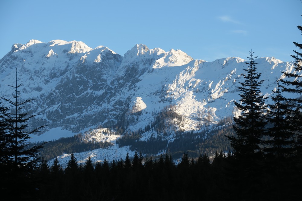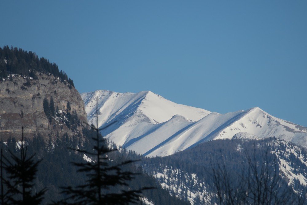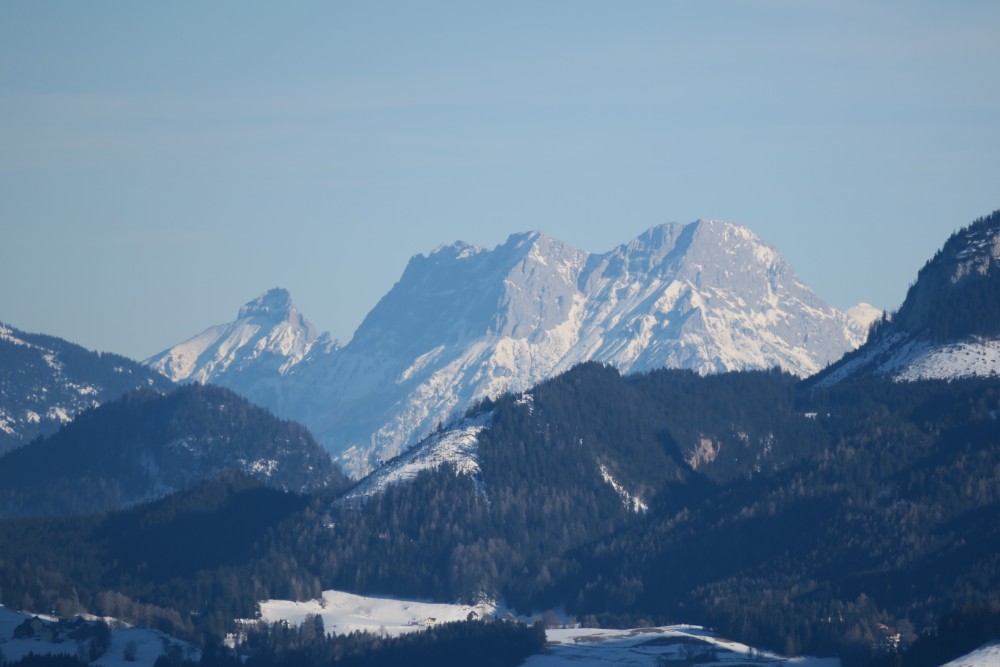 Bild 37: Lawinenstein links, davor Planwipfel mit der Simonywarte, ein Halbtagesziel, wenn ich zwischen den Therapien länger frei haben sollte. Rechts von der Sonne angeleuchtet die Bergerwand unterhalb des Weißkirchl (1526m), einem eher unbekannten Gipfelplateau.