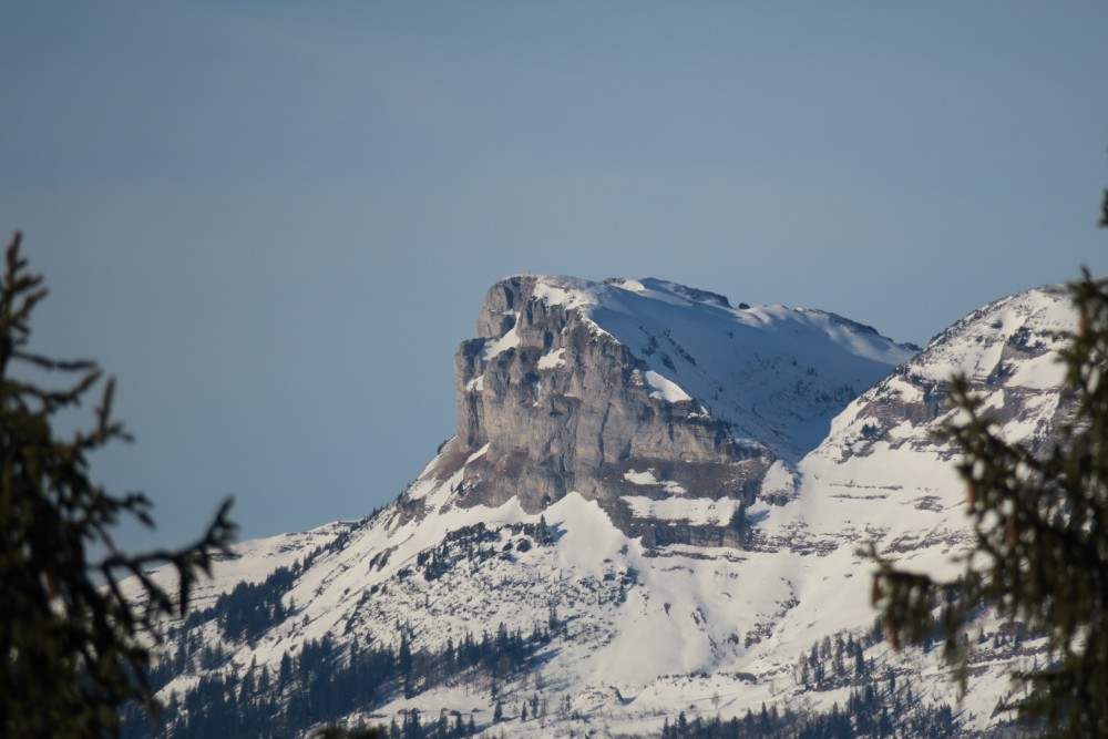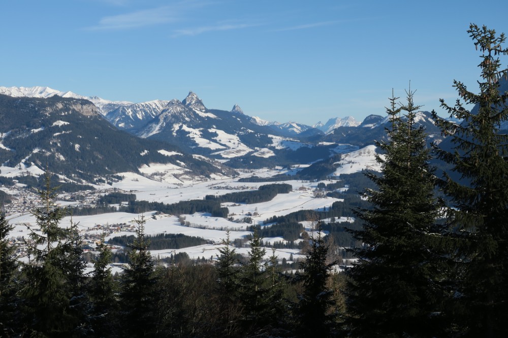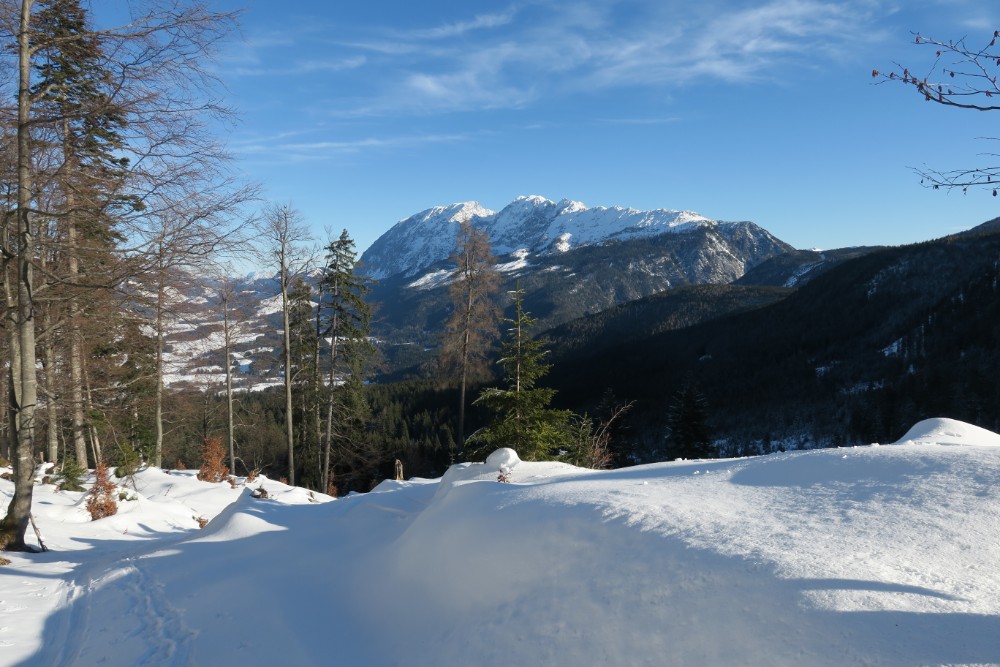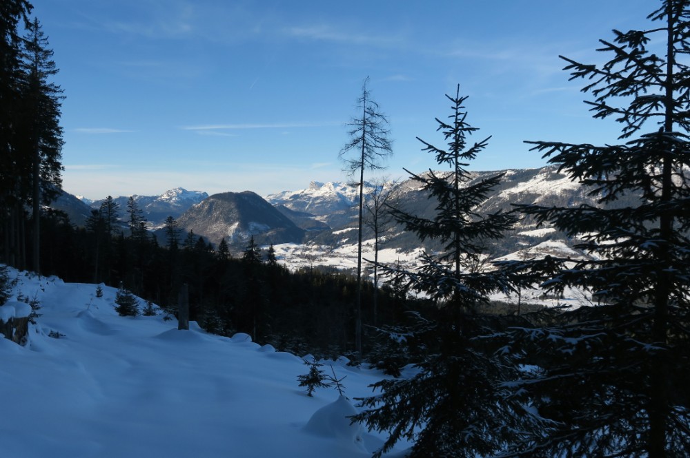 Bild 28: Herrlich unverspurt, noch pulvriger Schnee mit rund 1cm Reifansatz. Dieser dürfte schattenseitig beim nächsten Neuschnee ein Problem darstellen (lockere Unterlage). Mittig Hohe Radling (1398m), dessen Anstieg ich damals abbrechen musste, da sich der Jagdsteig im Steilgelände verlor. Links Sandling, rechts Loser.