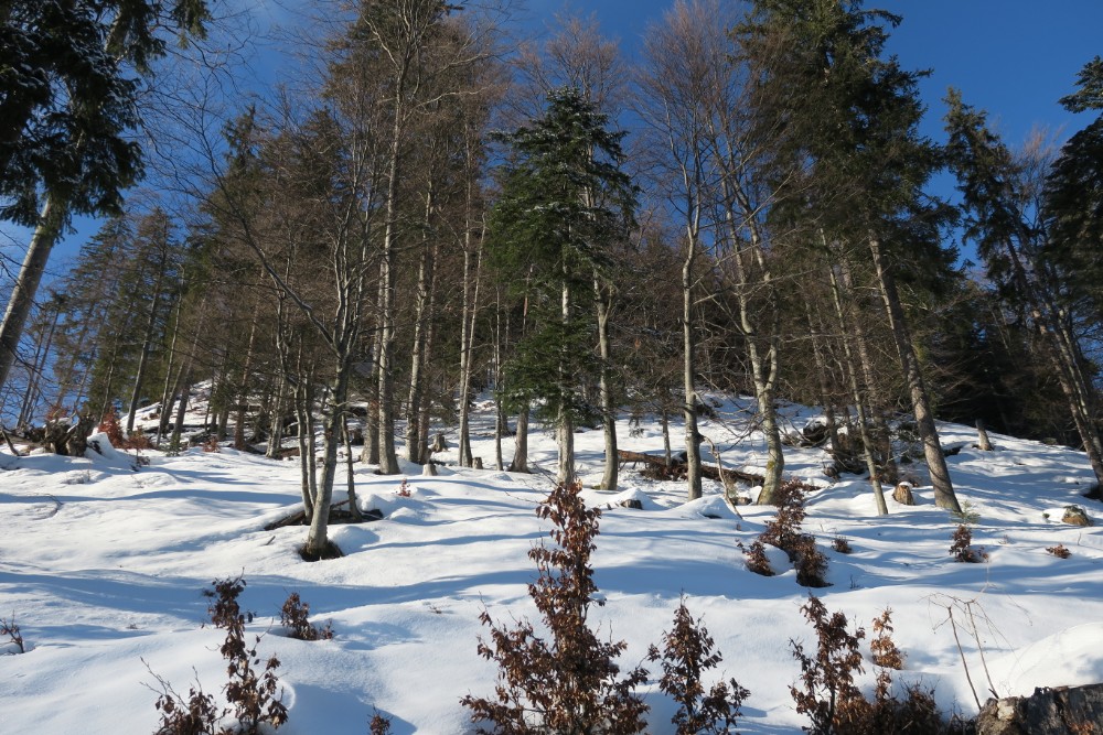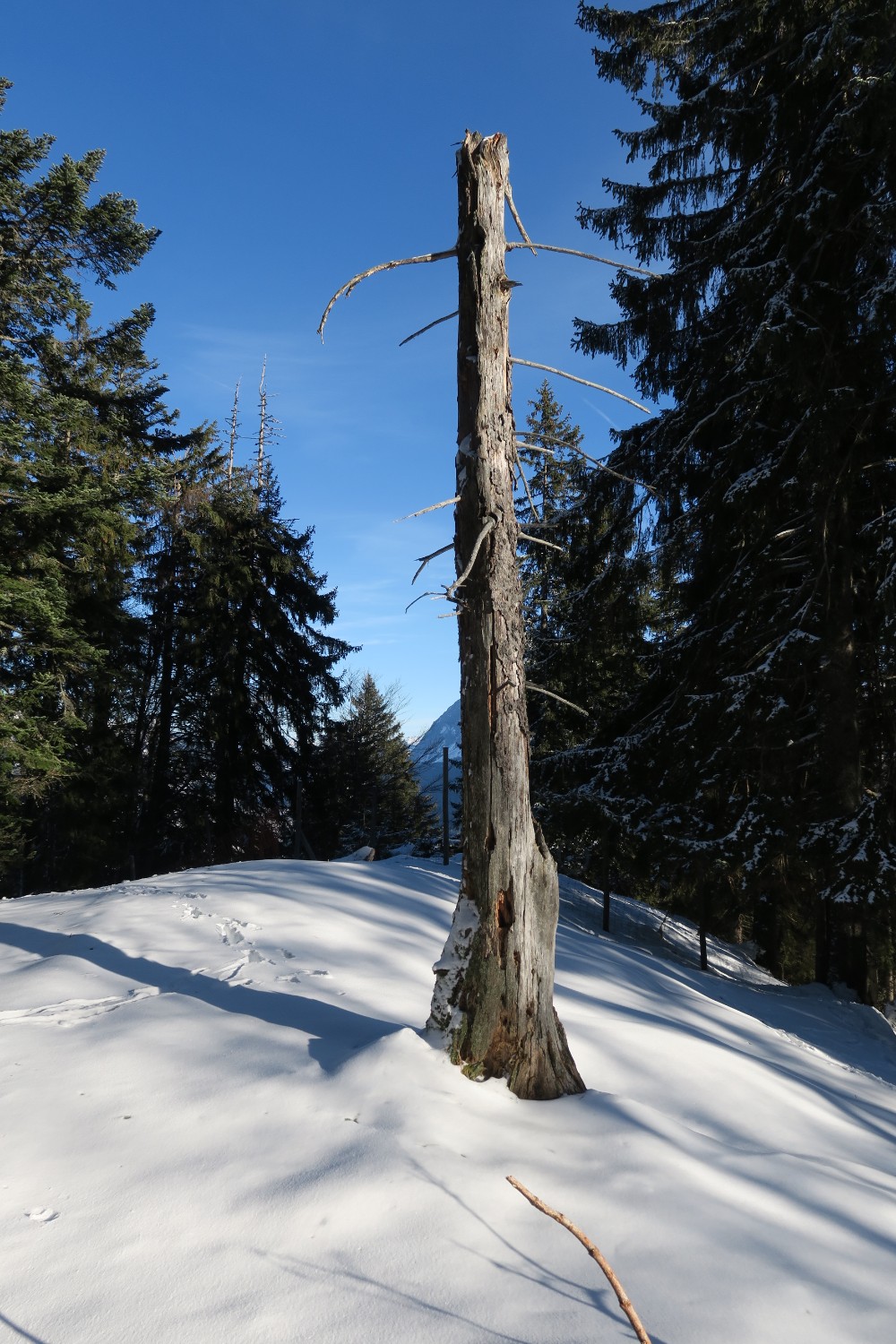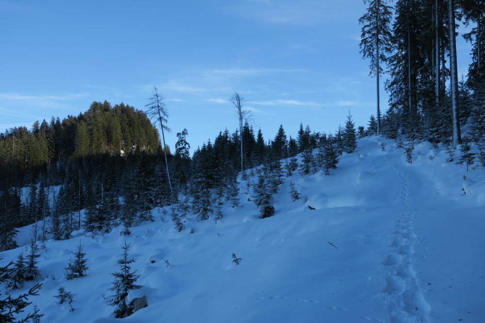 Das Spuren geht auf dem hartgefrorenen Schnee anfangs gut, je weiter hinauf man kommt, desto brüchiger wurde der Harschdeckel. Für wenige Höhenmeter klassischer Bruchharsch.