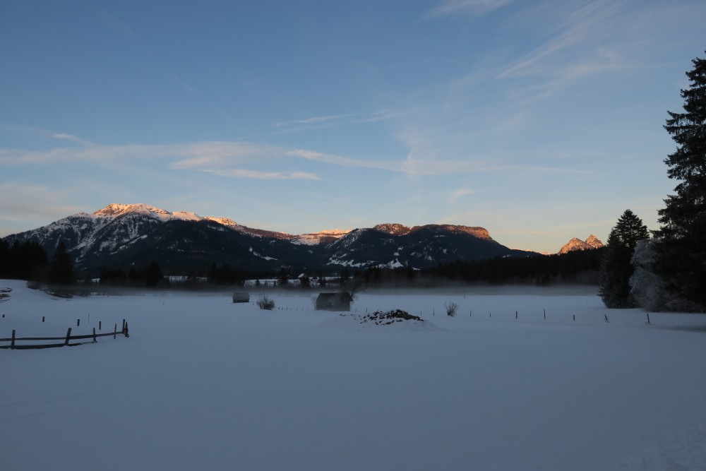 Im Talbecken breitete sich bereits wieder flacher Nebel aus, wenige Minuten nach Sonnenuntergang. Die Kaltluftschicht war sehr dünn, wuchs aber laut Höhe des Reifansatz an den umliegenden Bäumen im Laufe der Nacht noch etwas an, kaum mehr als zwanzig Meter Dicke insgesamt. Darüber blieb es etwas milder, Plusgrade oberhalb der Höheninversion ab etwa 1200m.