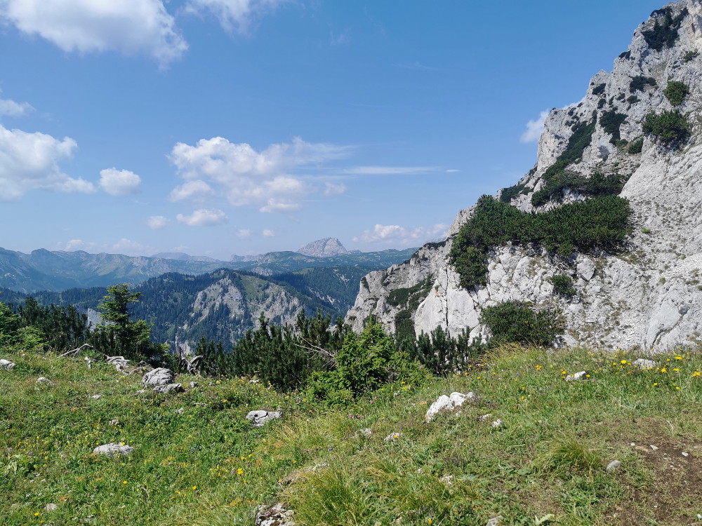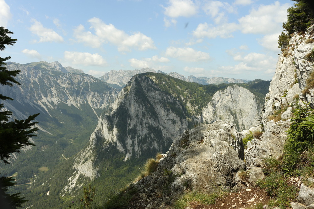 Der Steig führt mehrmals an die senkrechten Felsen heran, ist aber nur an zwei Stellen ein wenig ausgesetzt. Sonst einfach zu gehen und vor allem lange im Wald und damit auch südseitig lange vor der direkten Sonneneinstrahlung geschützt.