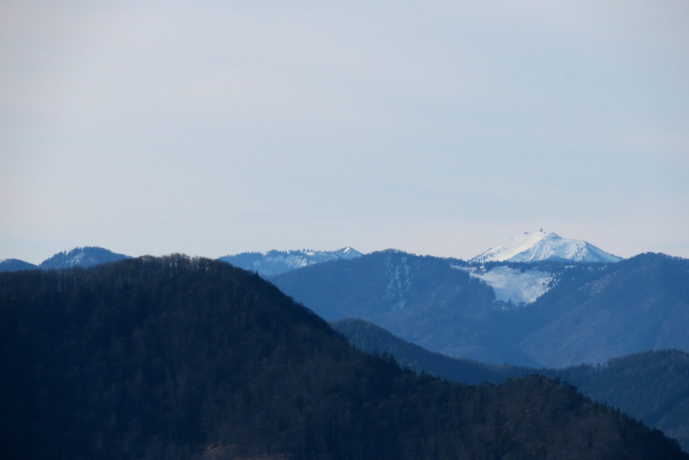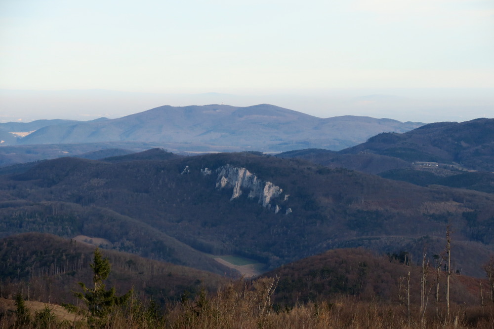 Genau zentral hinter dem Anninger Devínska Kobyla (514m,80km), und rechts der Hundsheimer Berg.