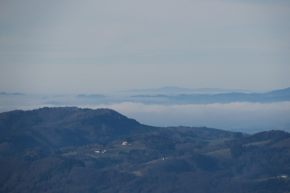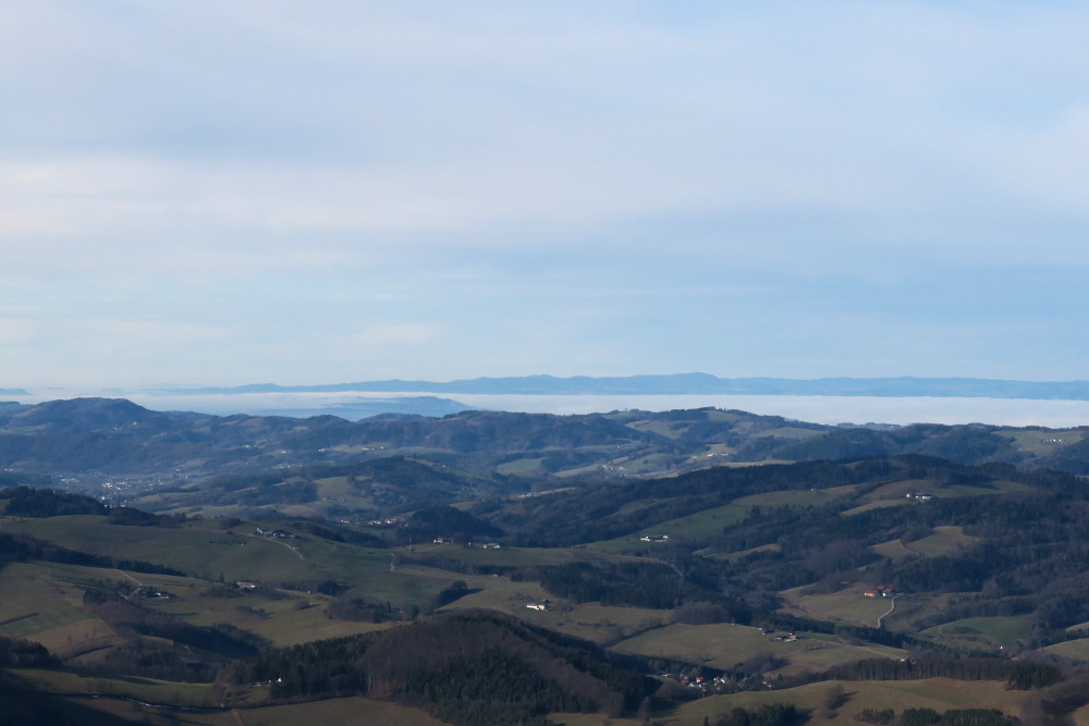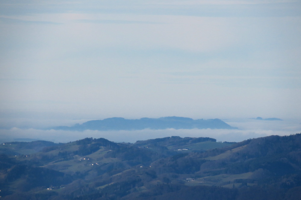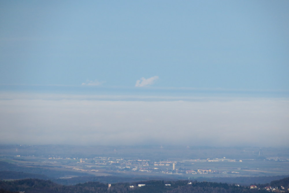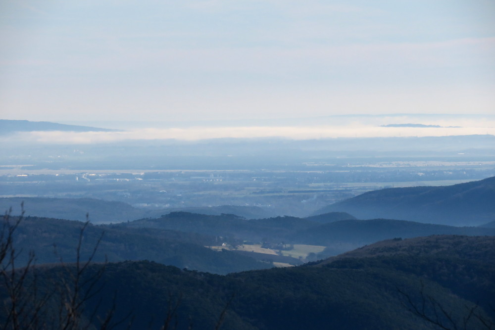 Bild 17: Im Nordwesten ein weiter Blick über den Wiesen-Wienerwald und Nebel im Donauraum bis zum Waldviertel mit Ostrong in der Bildmitte.