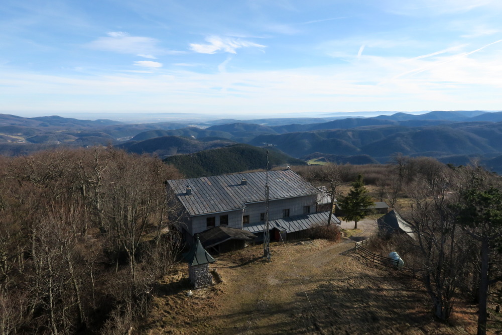 Bild 21: Blick über das Hocheck-Schutzhaus nach Südosten, mit Leithagebirge und Rosalia über der Dunstschicht.