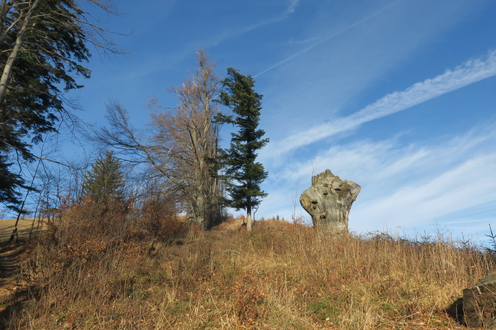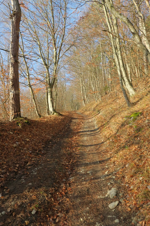 Die Inversion war recht scharf mit deutlichem Temperatursprung auf wenigen Höhenmetern, wie wenn jemand plötzlich den Backofen aufgemacht hatte. Bis auf drei Mountainbiker, die uns entgegen kamen, trafen wir bis zur Einmündung des nordseitig heraufziehenden Wieshofersteigs niemanden.