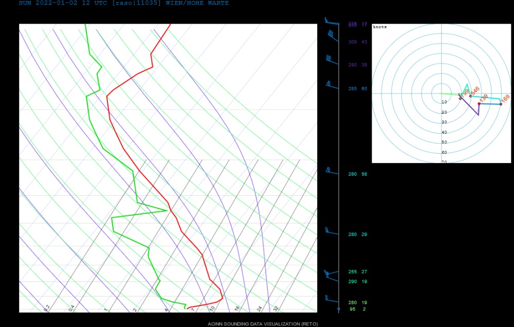 Tour mit Doris an einem denkwürdig zu warmen Jahresbeginn 2022. Auf der Hohen Wand wurden 18 Grad C gemessen. Der dritte zu warme Tag in Folge sorgte vor allem in den Höhenlagen für weitere Temperaturrekorde und frostfreie Nächte bis weit über 2000m hinauf. Bodennah kühlte es nachts hingegen markant ab. Schon im Süden von Wien sahen wir beim Verlassen der Südosttangente Reif auf den Wiesen, in Alland hielten sich flache Nebelfelder und auch im Triestingtal oberhalb vom Hafnerberg war es in den Niederungen frostig.