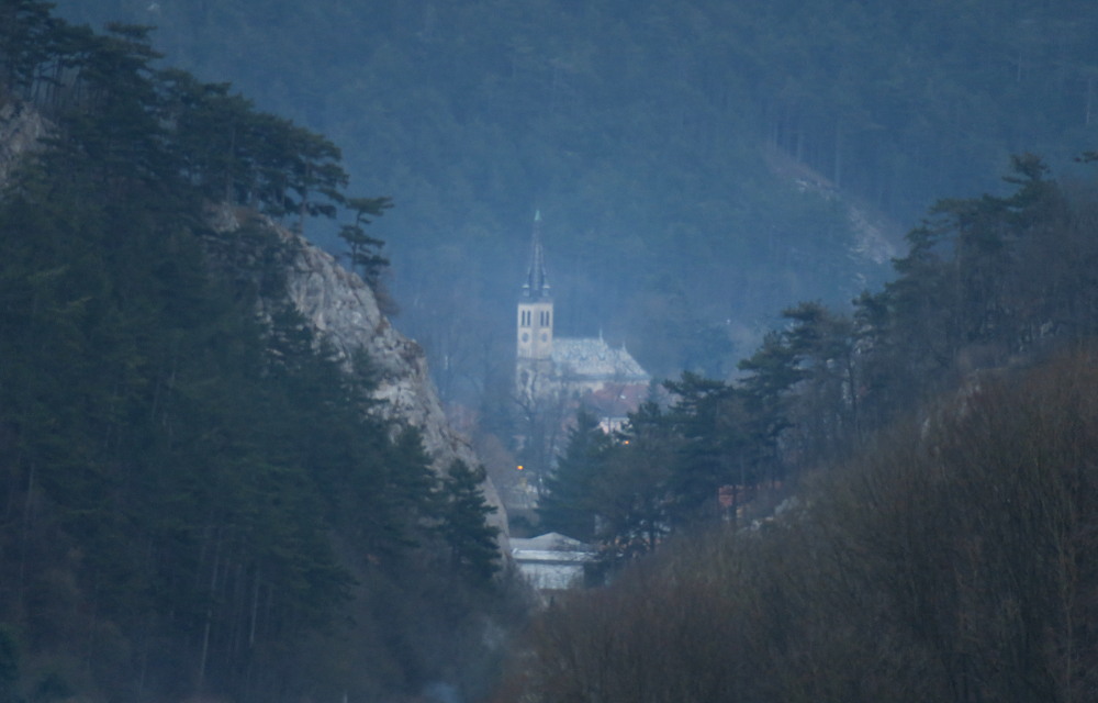 Bild 37: Die neugotische Pfarrkirche von Weißenbach an der Triesting hinter der Engstelle des Triestingtals zwischen Torstein (490m) und Tannberg (677m).