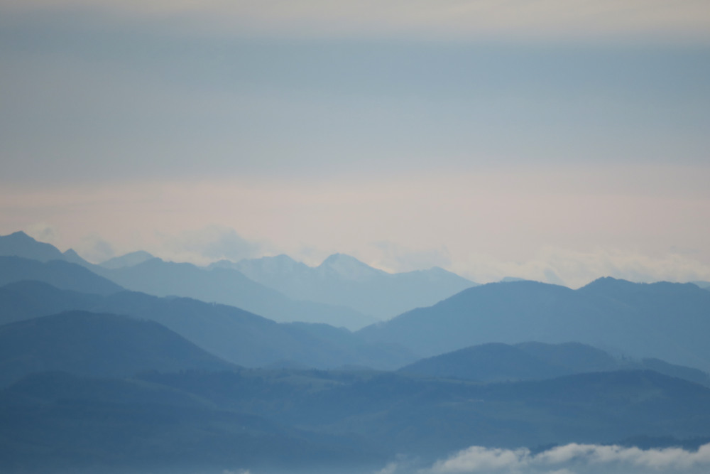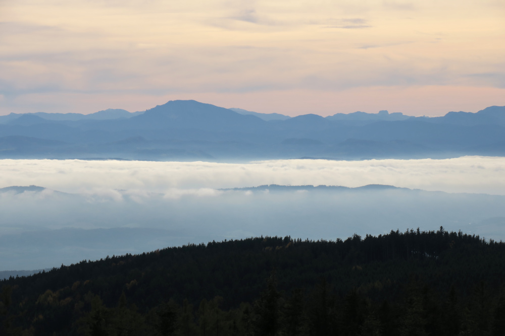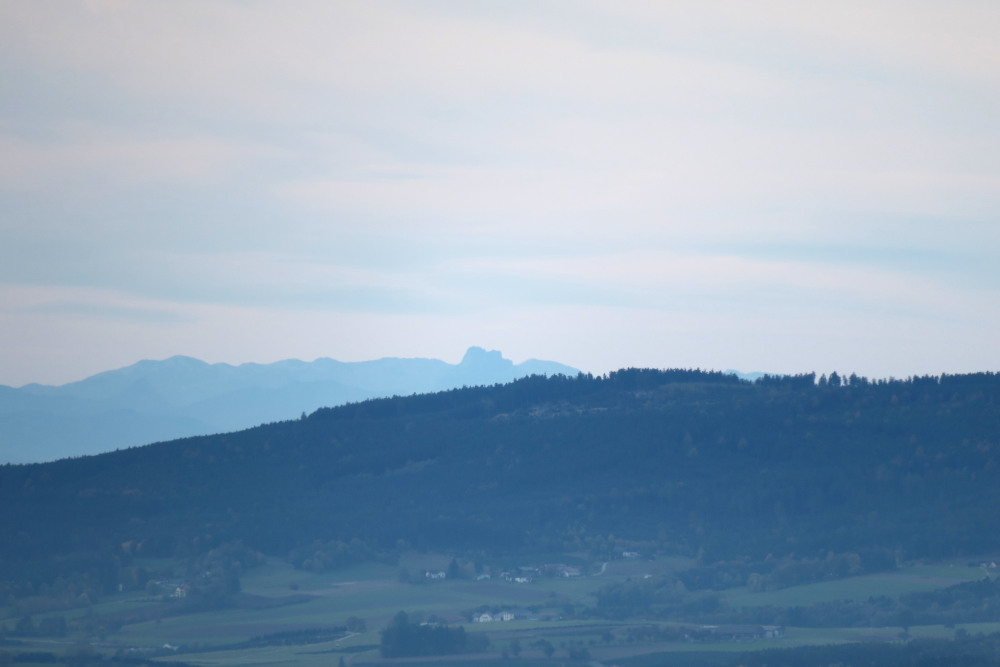 Bild 28: Links Großer Höllkogel (1862m, 137km), mittig Traunstein (1691m,122km), rechts knapp über dem Wald Brunnkogel (1708m,139km).