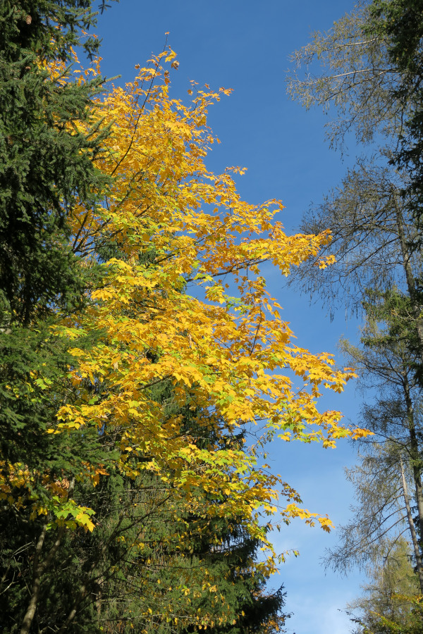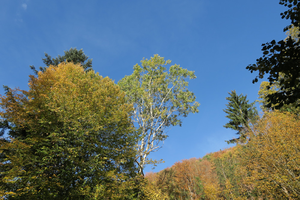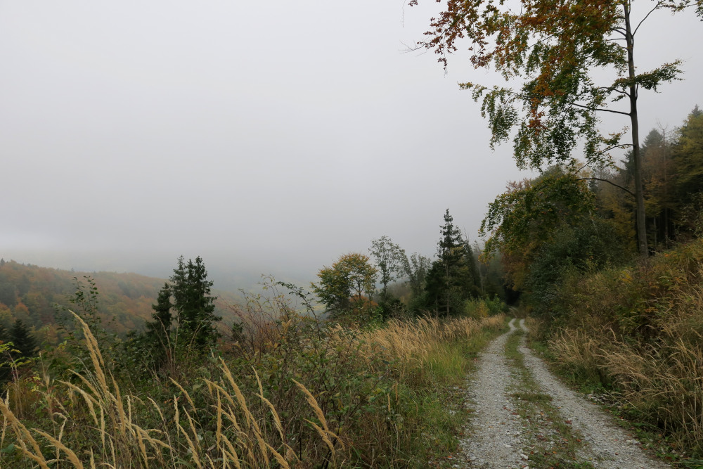 Einzelne Wegabschnitte waren durch umgestürzte Bäume etwas mühsam, aber passierbar. Überraschende Waldarbeiten an einem Sonntag im Wald links vom Weg. Natürlich ein unangeleinter Hund dabei, der zum Glück sehr klein war und ein Stück am Hang entlang argwöhnisch schaute, wohin ich ging. Er bellte aber nicht. "Hab nur gschaut."