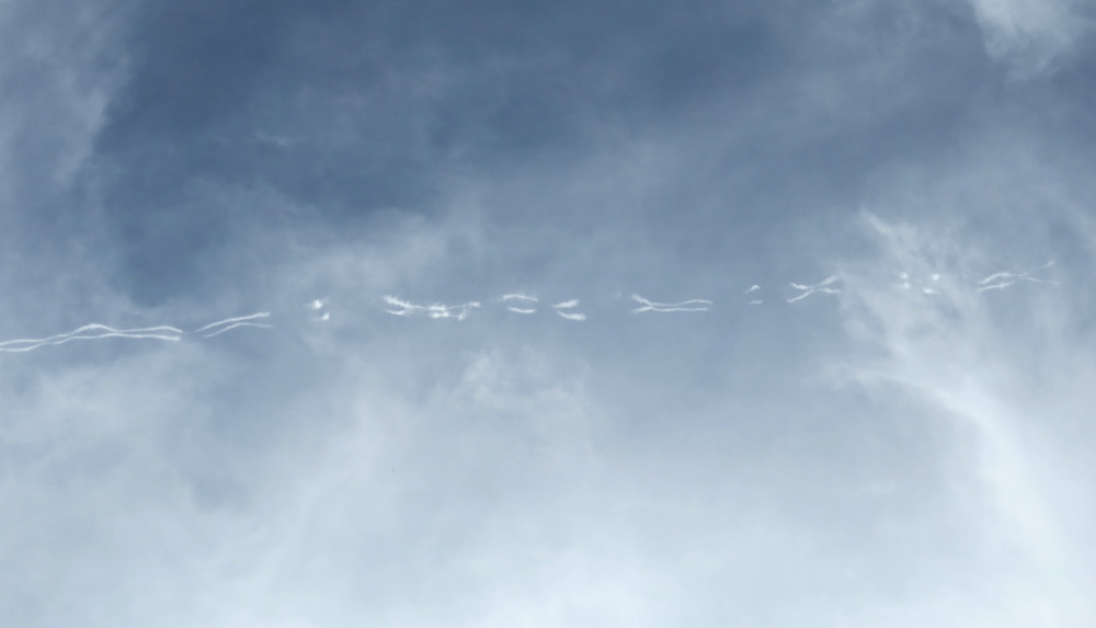 Bild 31: Wirbelschleppen durch ein großes Flugzeug an einem Kondensstreifen, der die sogenannte Crow-Instabilität auslöst.