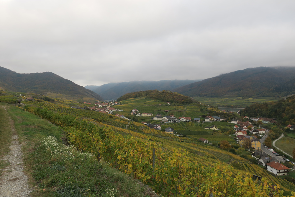 Naturgemäß ist mir wieder niemand begegnet. Bei Sonnenschein hätte man immer wieder herrliche Blicke in die Weinberge unten.