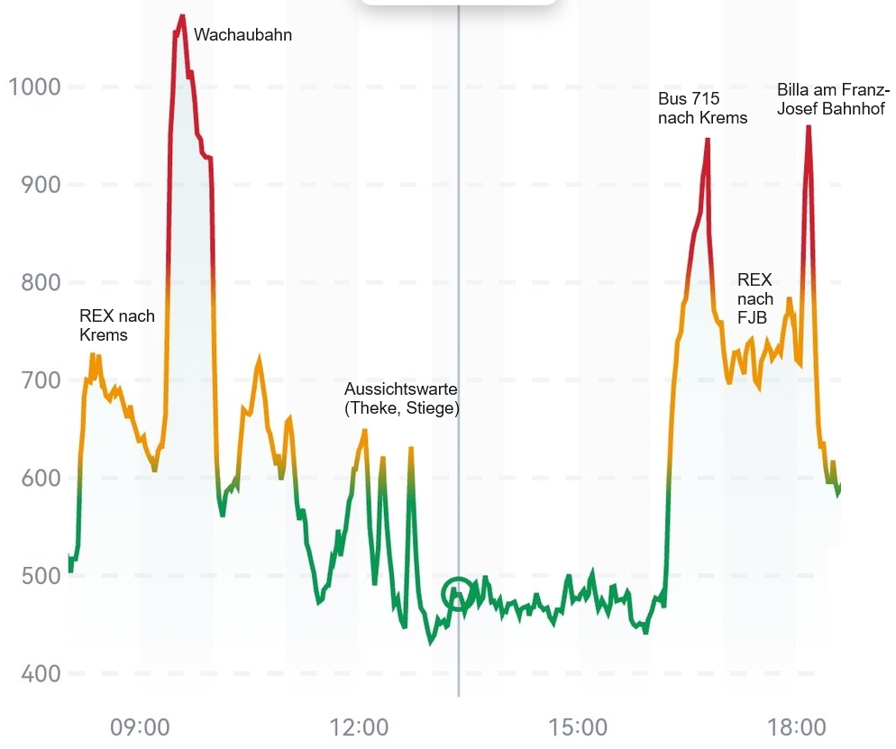 Im mäßig besetzten REX relativ gut, in der gut besetzten Wachaubahn trotz ohrenbetäubender Lüftung schlecht. In der Aussichtswarte relativ gut durchlüftet, bei der Theke stand die Tür offen. Auf der Rückfahrt wars dann recht voll im Bus, keine gute Luft. Im REX erneut nicht ganz so schlecht und im gut gefüllten Billa am Bahnhof hats die Klimaanlage dafür nicht geschafft mit der Frischluftzufuhr. In Summe bleibe ich beim Maske tragen in schlecht belüfteten Räumen, dafür kann ich dann den restlichen Tag in der Natur Frischluft tanken.