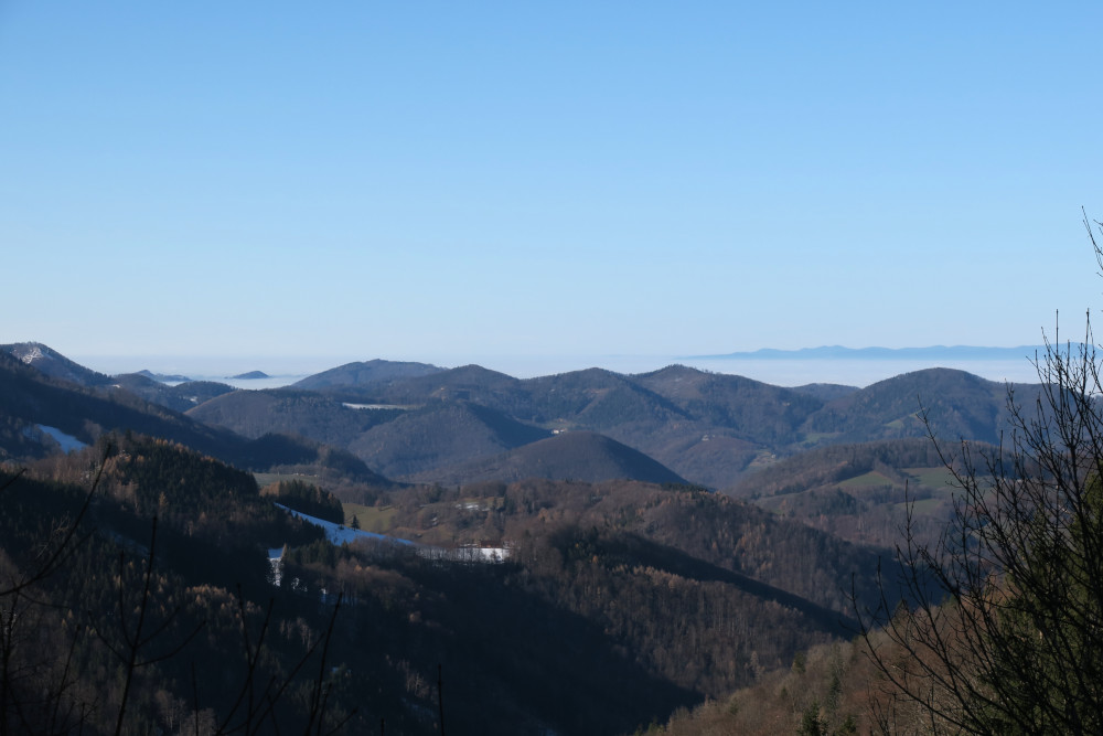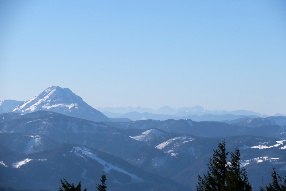 Rechts als Pyramide Hochbuchberg (1273m), ganz links als Spitzerl Pfannstein (1423m,118km).
