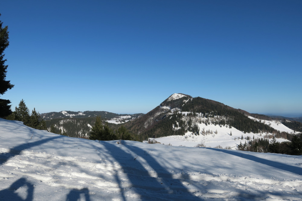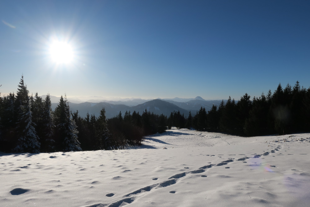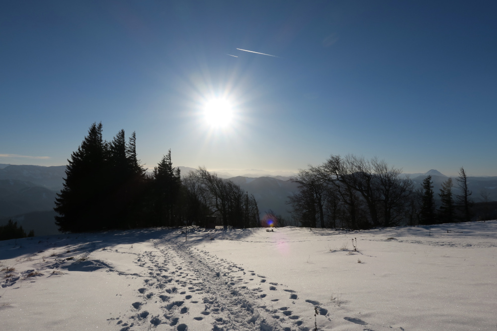 Die Schneelage hätte es durchaus erlaubt, mit Schneeschuhen zu gehen, aber durch die festgetretene Spur kam man auch so gut voran. Es lagen etwa 10-15cm auf der Ebenwaldhöhe und gut 20-30cm auf den letzten dreihundert Höhenmetern.