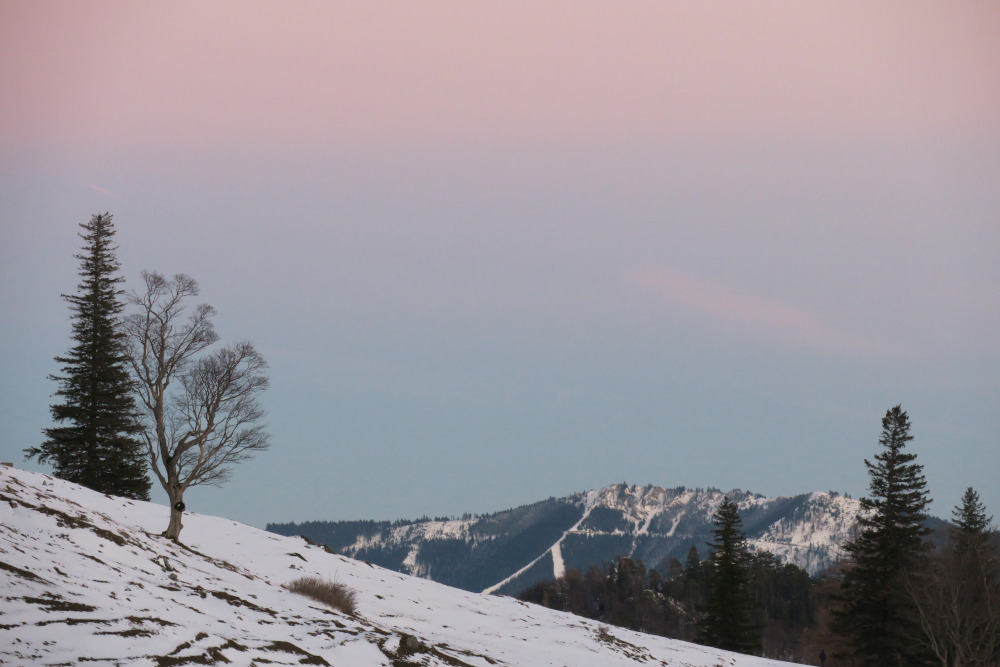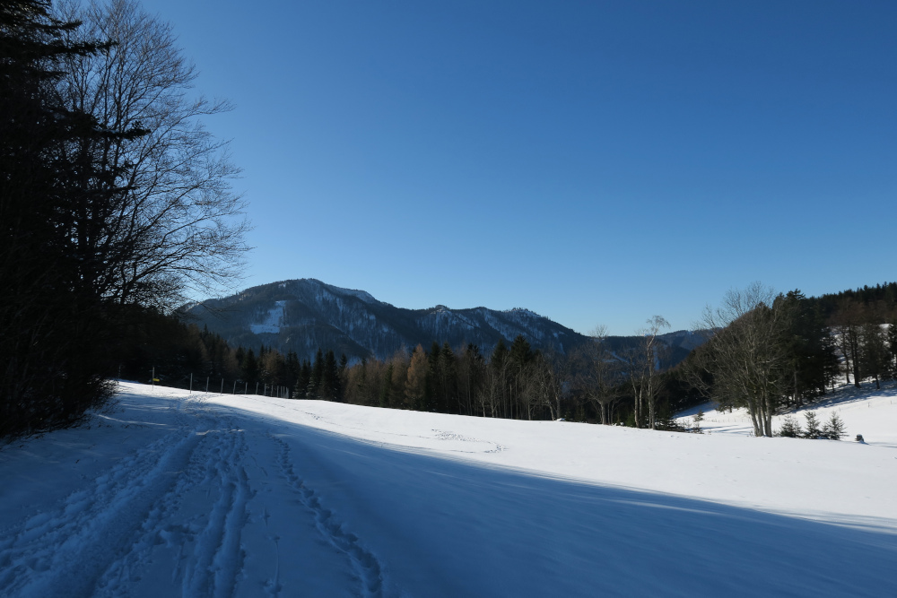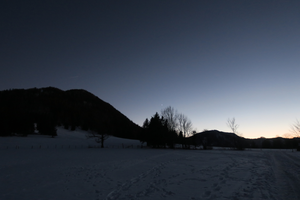 Der Rückweg auf dem Forstweg mit 200hm Gegensteigung war ungespurt und so durchaus noch einmal anstrengend, aber das Abendlicht entschädigte.