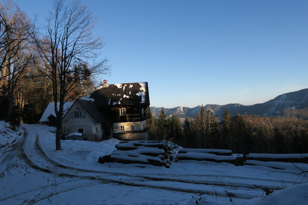 Beim Besuch 2021 sah man weiter rechts noch die Ruinen eines älteren Gebäudes. In einem alten Bild in der Hütte sah man das Gebäude nebenan noch stehen.