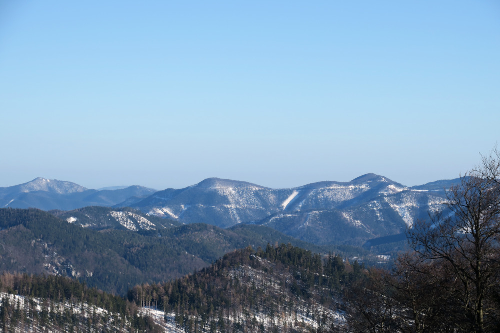 Links dahinter Gromann (1076m), dahinter Angelsberg (952m) und Schwarzenberg (958m), in Bildmitte Spadenberg (1000m).