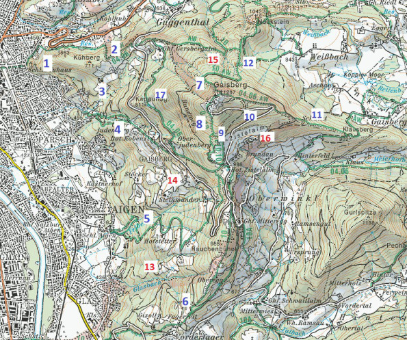 In meiner Salzburger Zeit war der Gaisberg mein Hausberg: Meine Standardroute führte anfangs von Obergnigl über den Kühberg und Gersbergalm über die vielen Kehren zum Gipfel. Als die Endhaltestelle der Linie 2 wegen einer Großbaustelle aufgelassen wurde, disponierte ich zum Ausgangsort Parsch um (Endhaltestelle Linie 6). Beim Gehöft Hiesl gab es immer Katzenbegegnungen, was ein zusätzlicher Anreiz war. Dort führt eine phasenweise sehr steile asphaltierte Straße bis zur Gersbergalm.