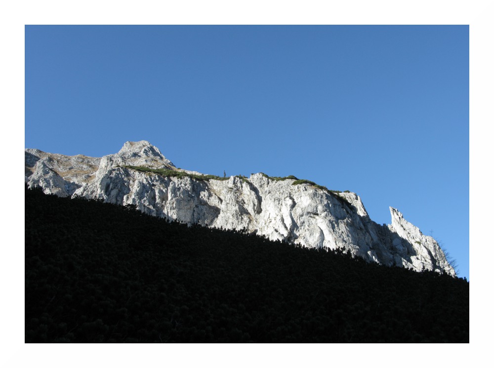Nach kurzer Gipfelrast, wo man es wegen der gefühlten -15 Grad nicht lange aushielt, stiegen wir zur Gingatzwiese ab, um von dort die Wildkammüberschreitung in Angriff zu nehmen. Diese Route ist unmarkiert, bis zum wiesendurchsetzten Grataufschwung gibt es aber einen Steig durch die Latschengassen. Ab hier wird es schwierig: Die ersten drei Felszacken am Grat sind erheblich ausgesetzt und ungesichert, wobei es Ringhaken gibt. Die Schwierigkeit würde ich mit UIAA I beurteilen, wobei der letzte Felszacken Richtung I+ geht. In weiterer Folge bis zum Gipfel des Großen Wildkamms gehen die Steigspuren direkt am Grat weiter - es bleibt somit luftig, aber durchwegs im Gehgelände. Stolpern sollte man aber nicht.