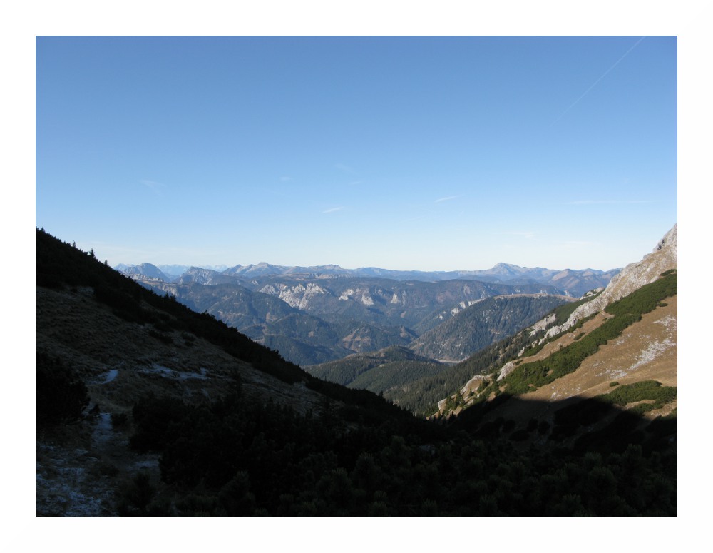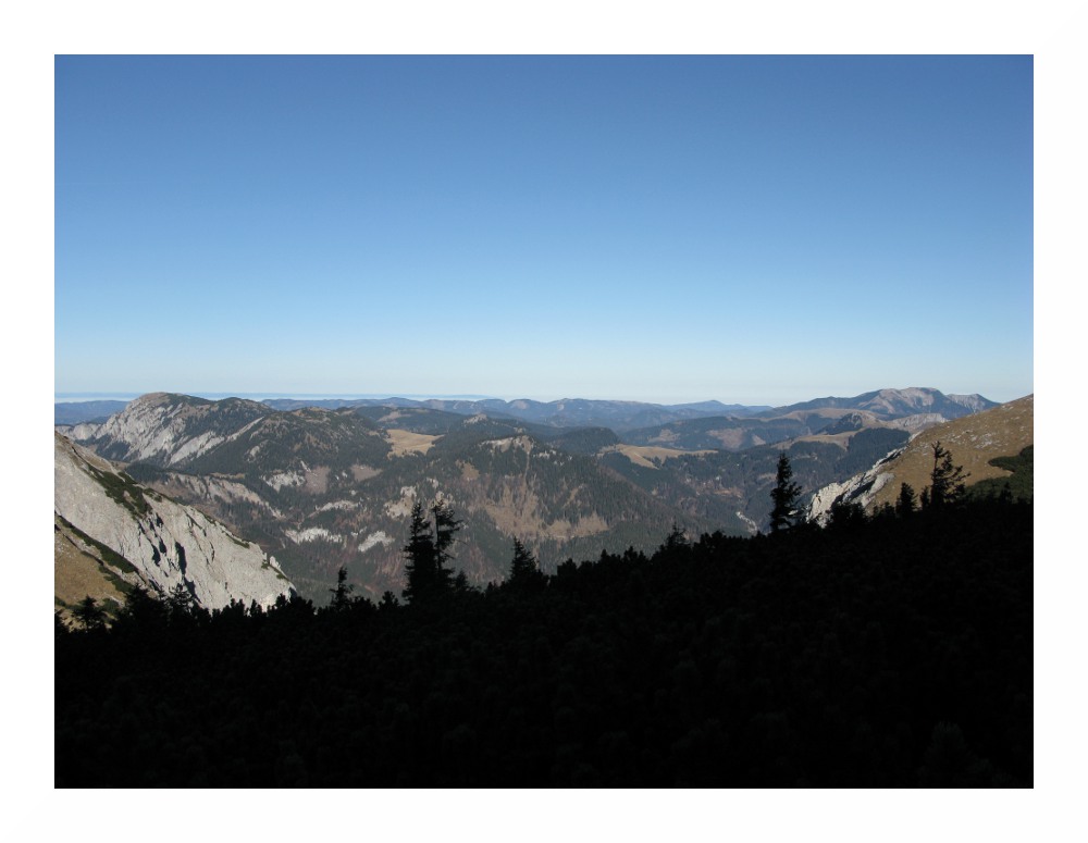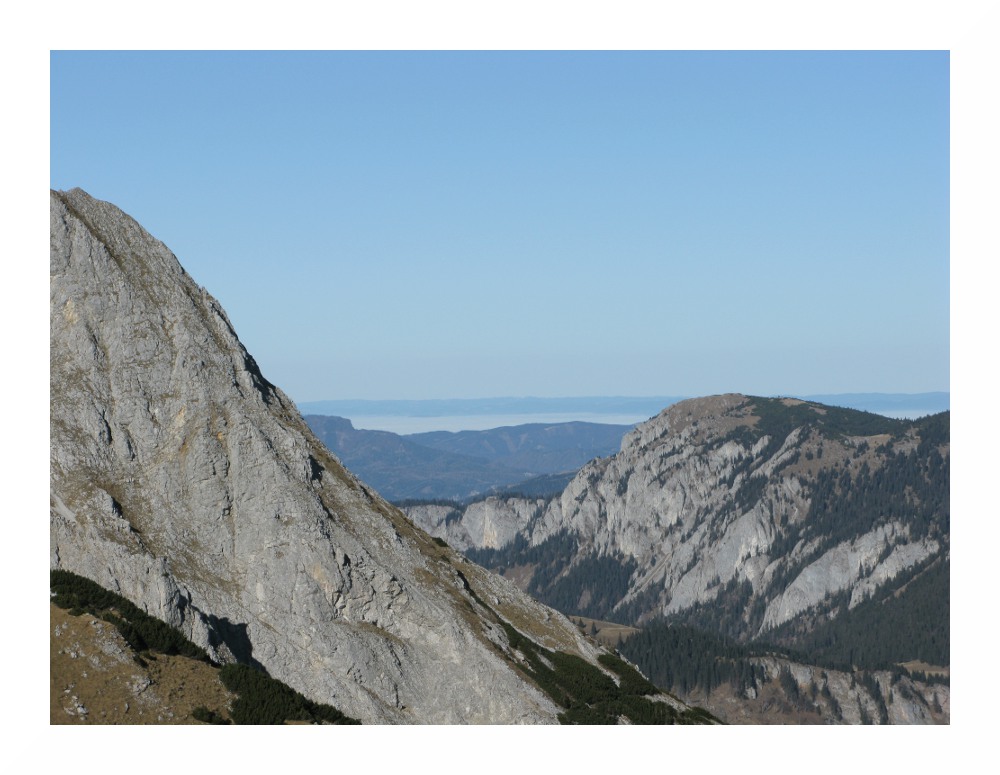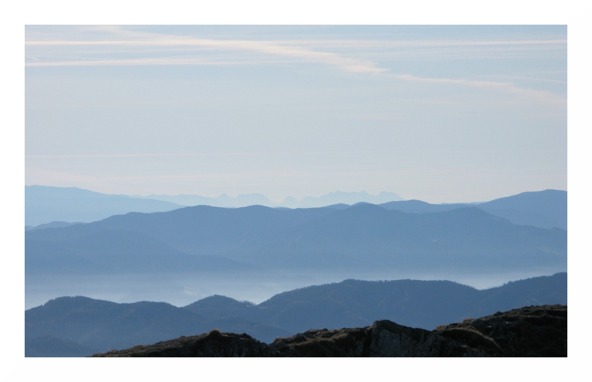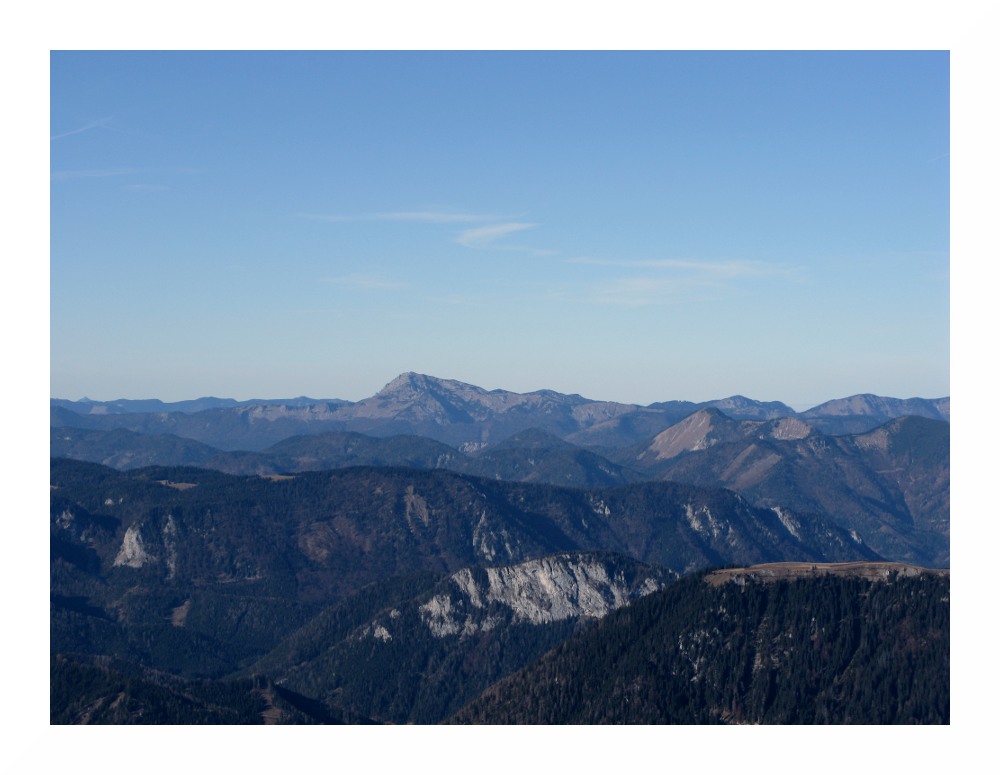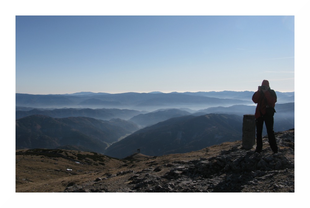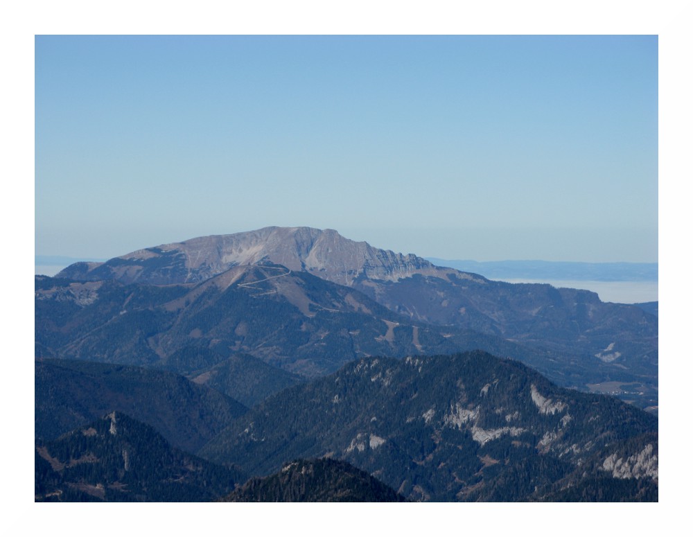 Im Vordergrund das weitläufige Gipfelplateau, im Hintergrund Schneealpe, Raxalpe (rechts mit Heukuppe) und mittig ganz hinten Schneeberg. Rechts der Rax gehts zum Preiner Gscheid hinab, dahinter erstreckt sich vom Steinfeld bis ins Pannonische Becken der Hochnebel.